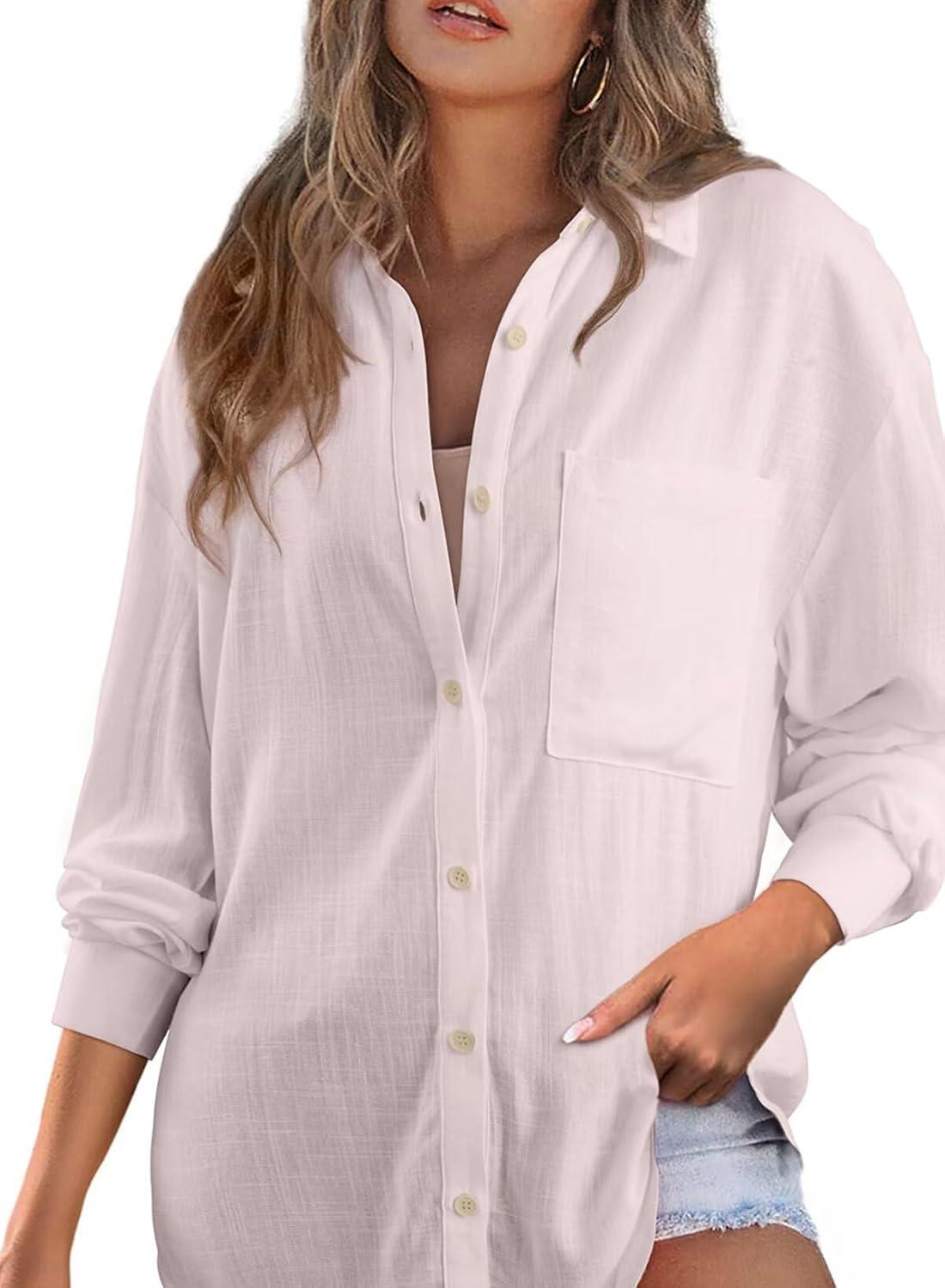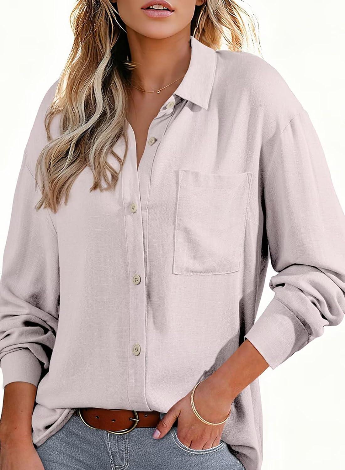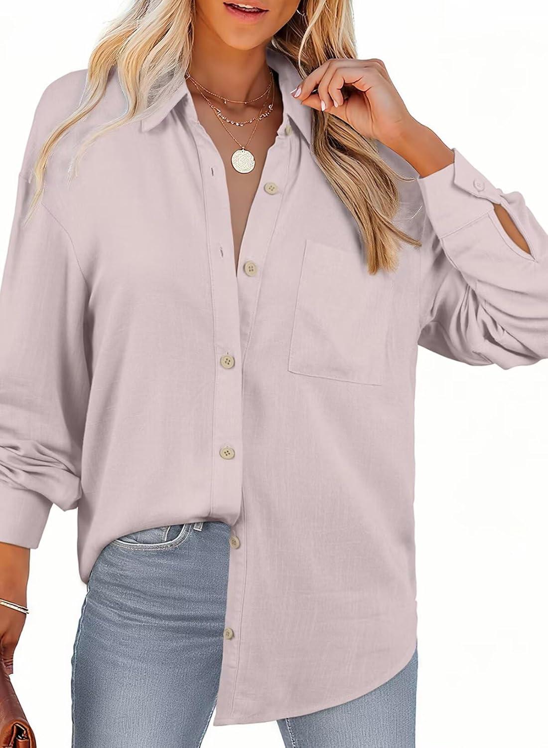 Astylish Women 2026 Loose Fit Tops Cotton Linen Button Down Shirts Collared Roll Up Long Sleeve V Neck Blouses(Light Pink)