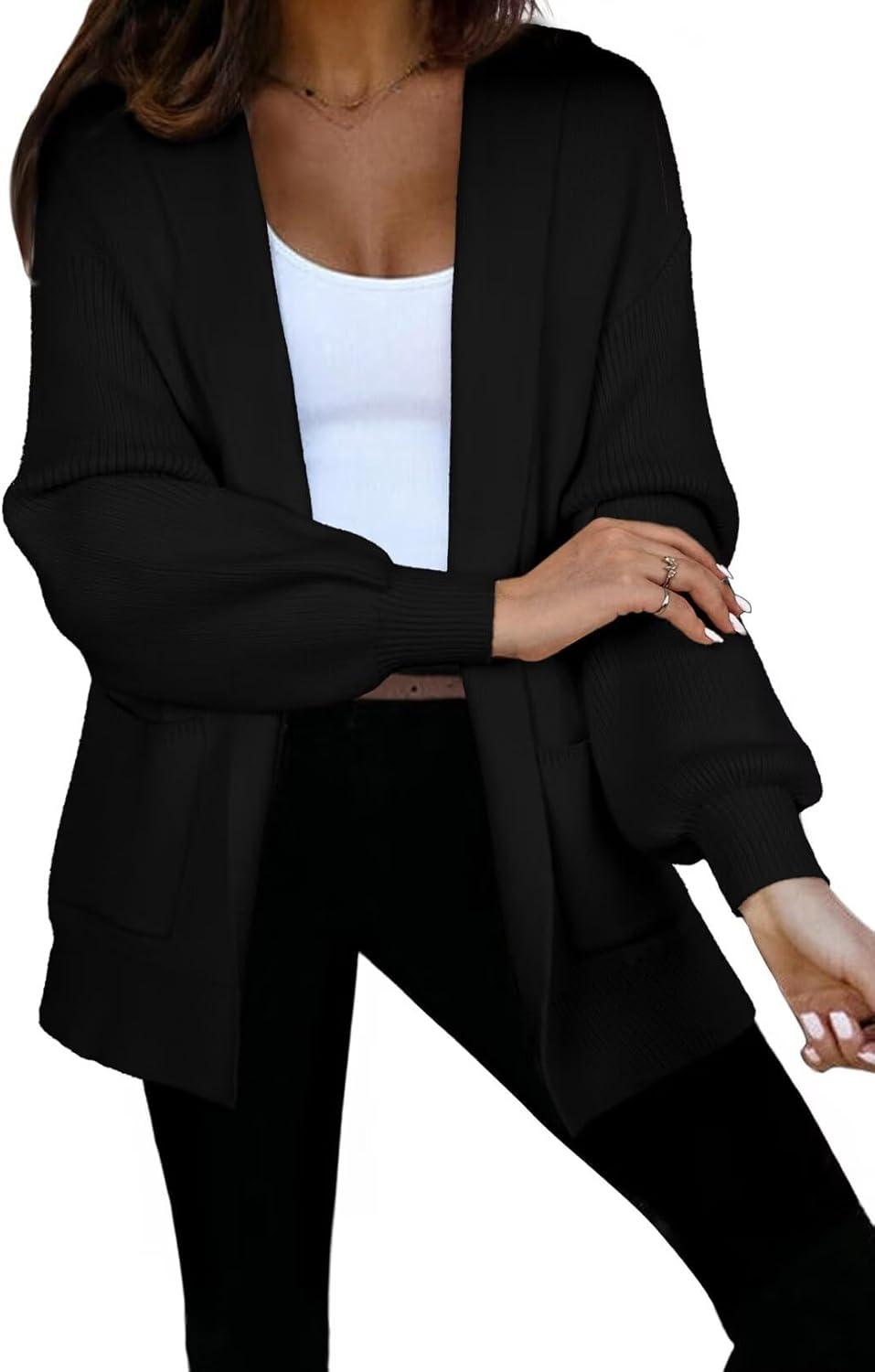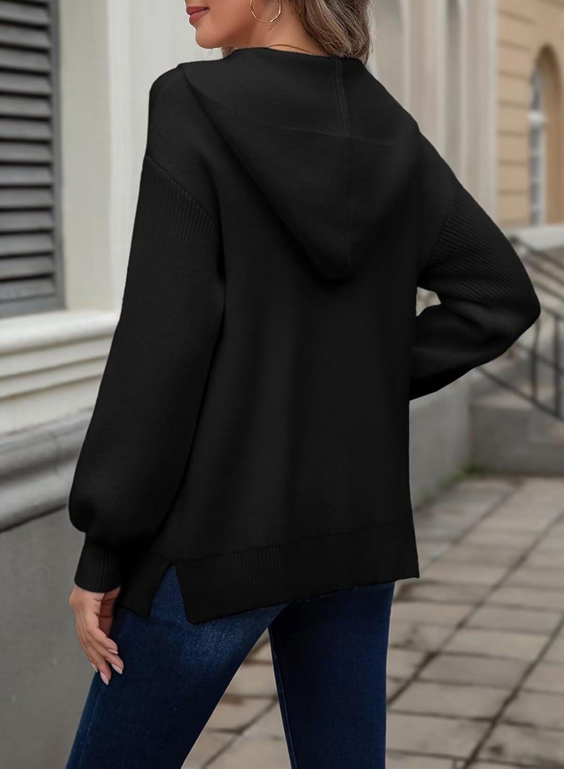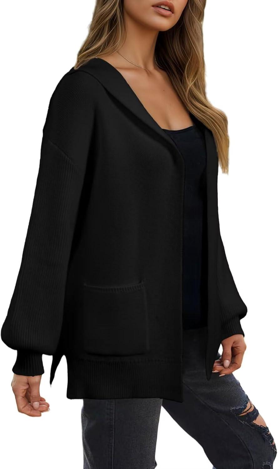 Astylish Women Hooded Cardigan Sweaters Chunky Open Front Pockets Oversized Solid Ribbed Outerwear Fall Outfits(Black)