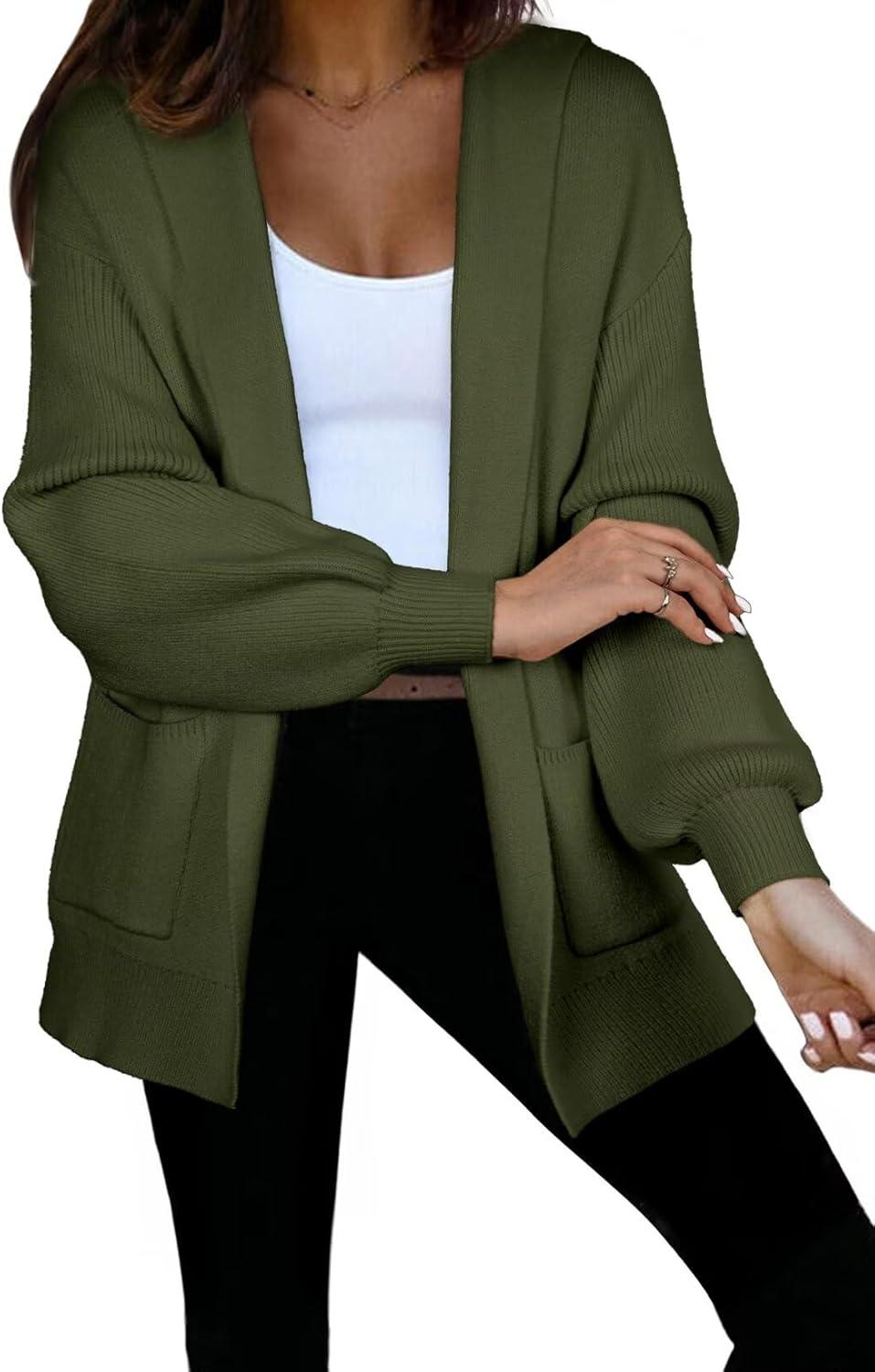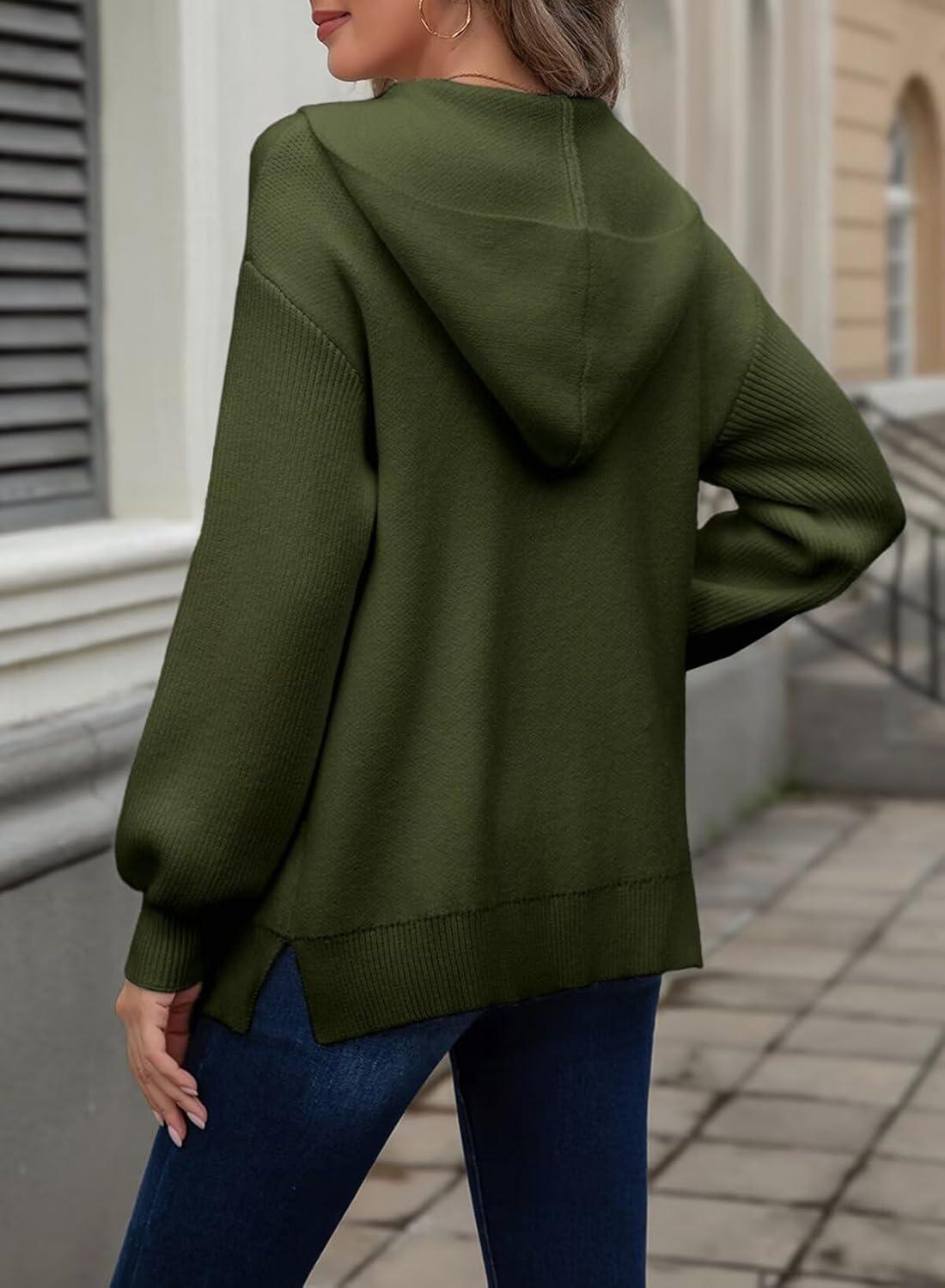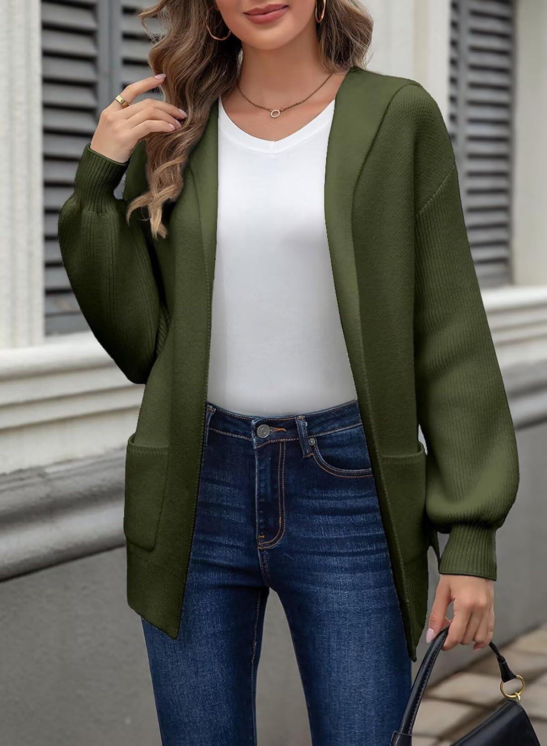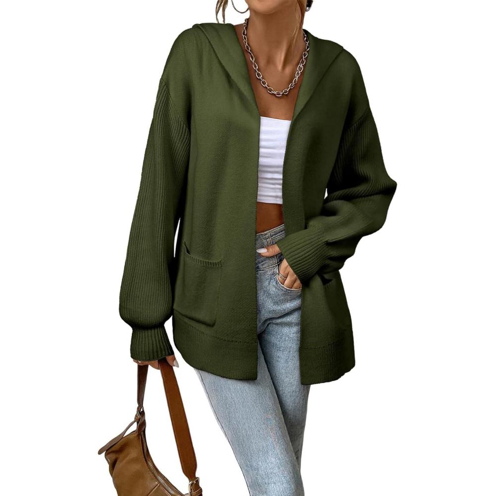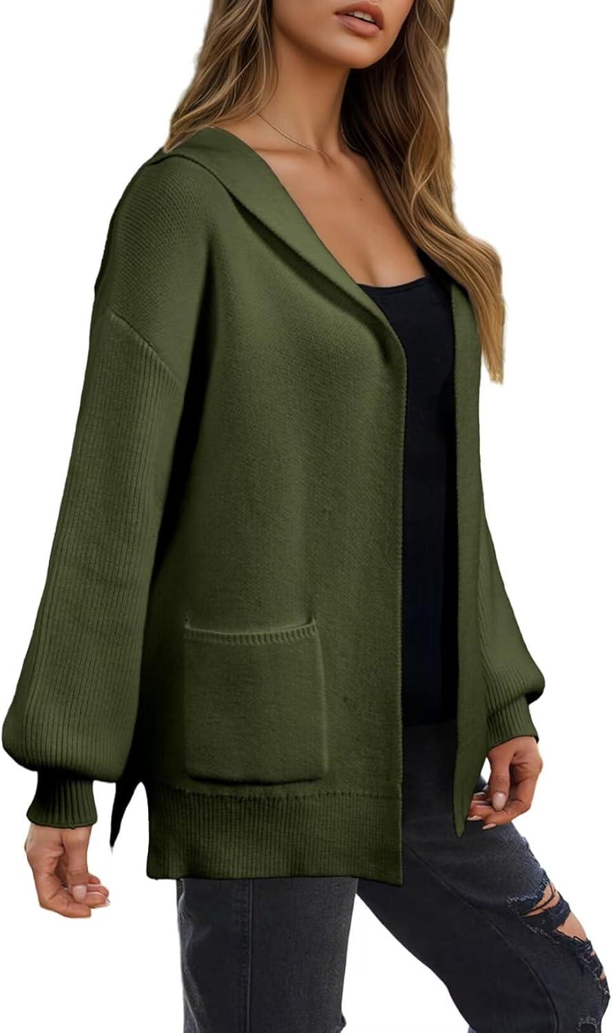 Astylish Women Hooded Cardigan Sweaters Chunky Open Front Pockets Oversized Solid Ribbed Outerwear Fall Outfits(Blackish Green)