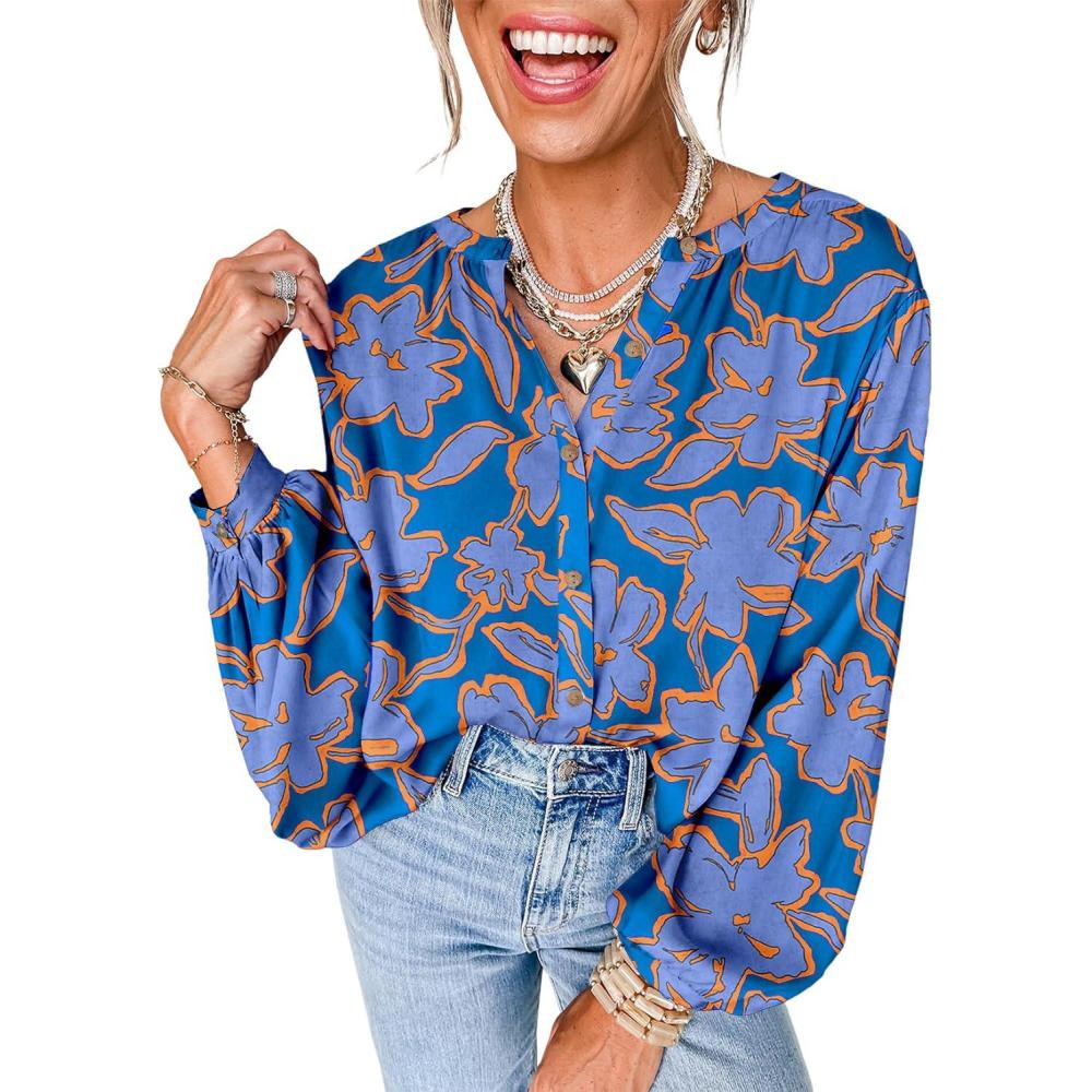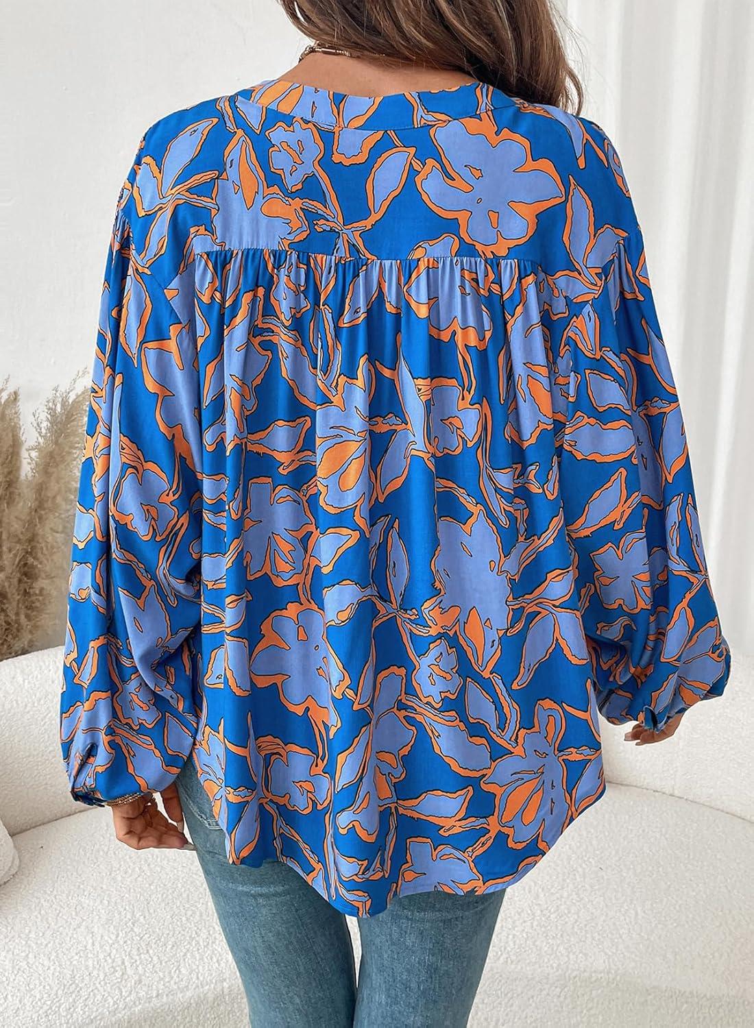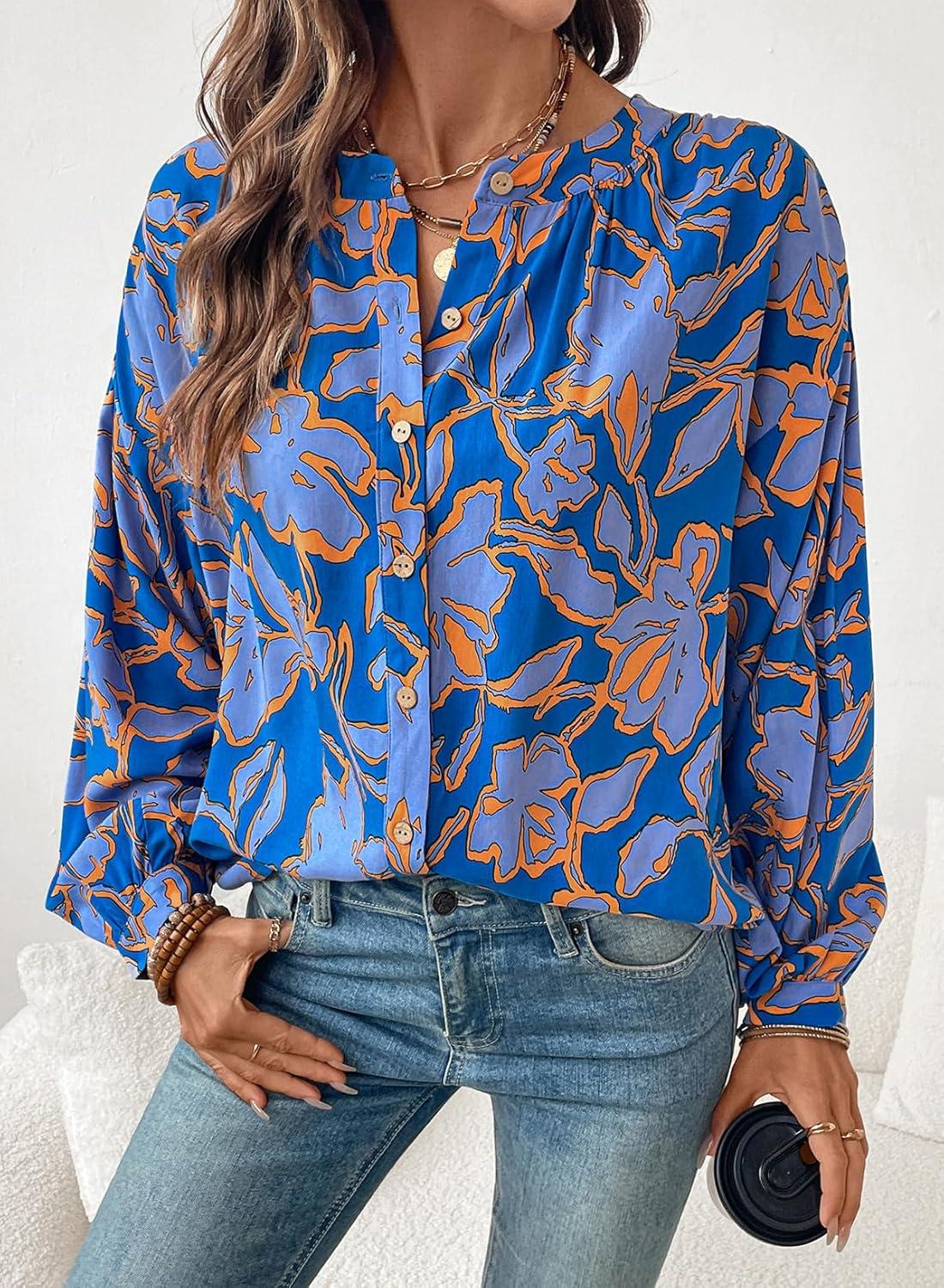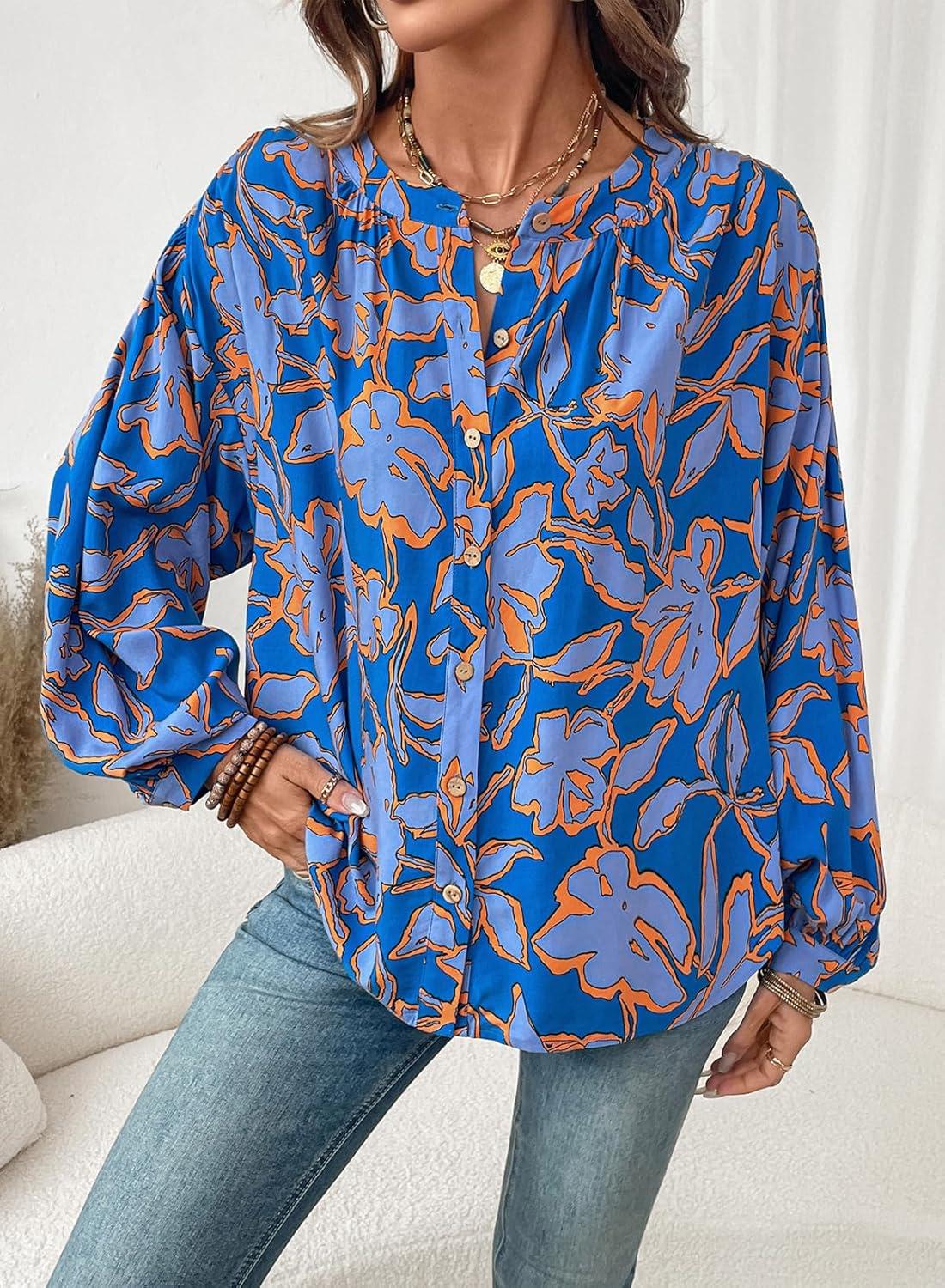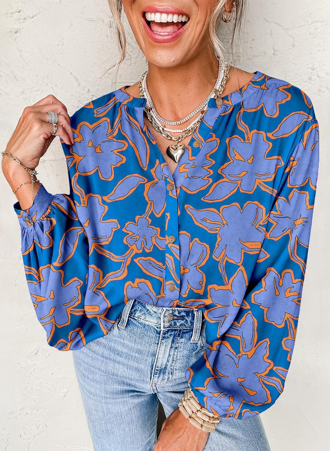 Astylish Womens 2026 Boho Floral Loose Spring Summer Tops Lantern Sleeve Flowy Blouses V Neck Button Down Shirts(Blue)