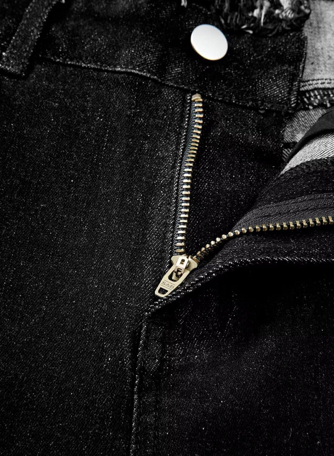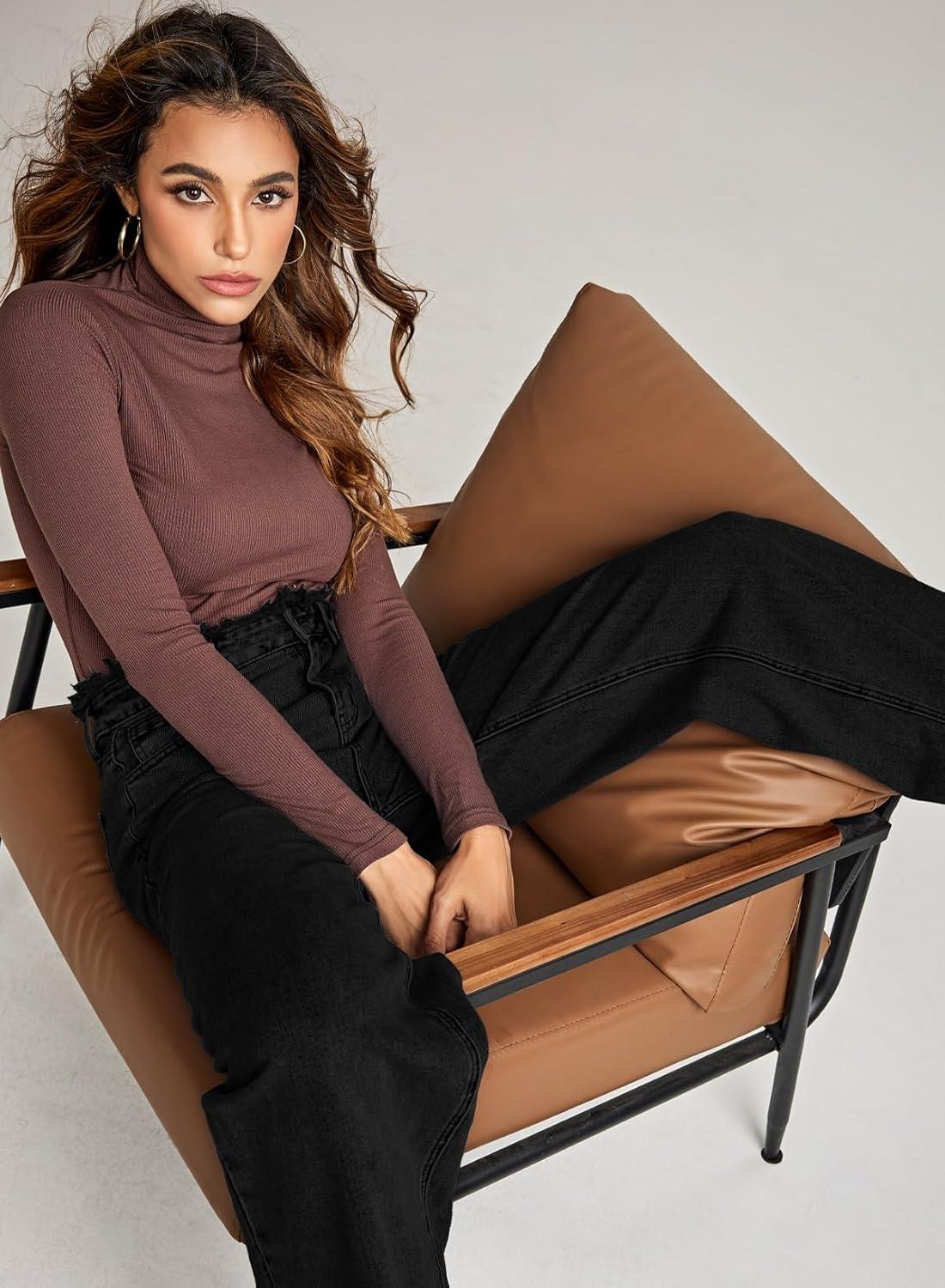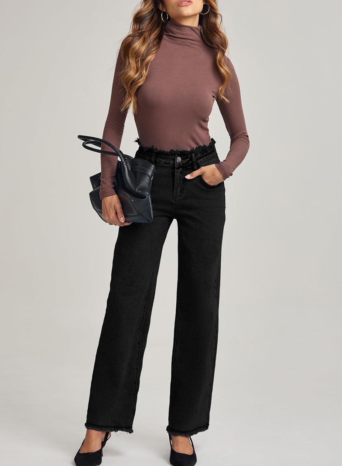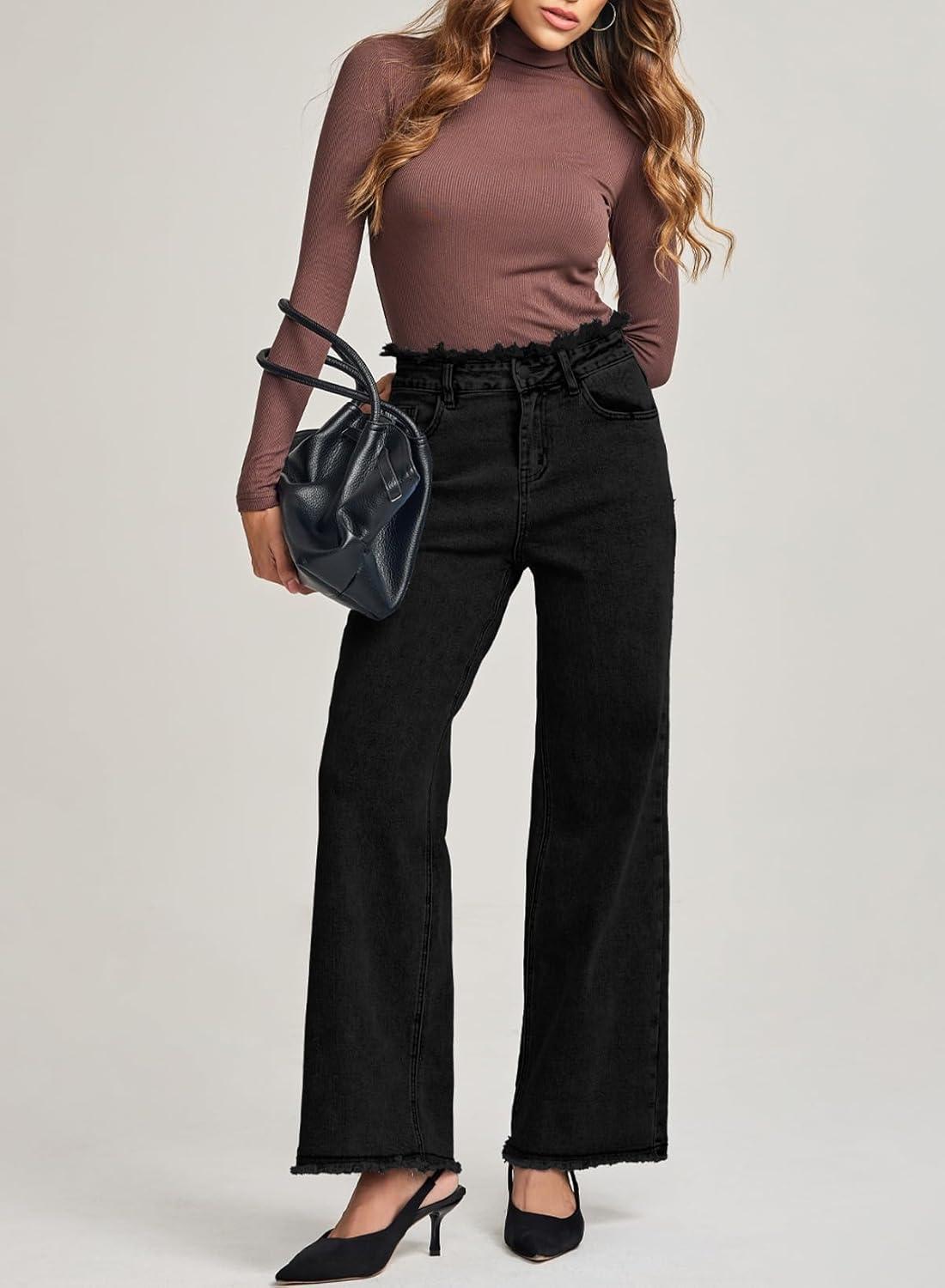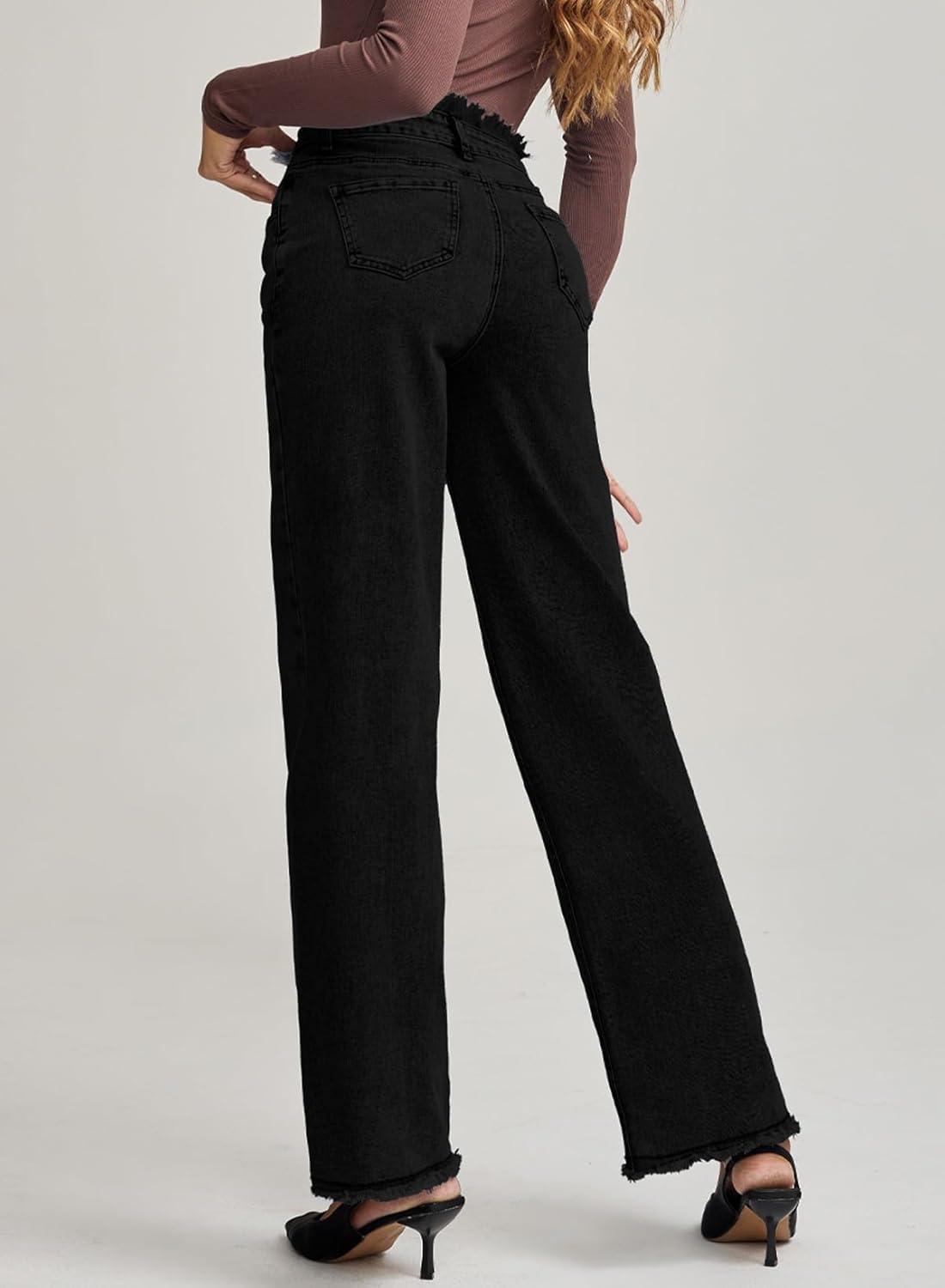 Astylish Womens High Waisted Raw Hem Jeans Stretchy Wide Leg Frayed Straight Denim Pants(Black)