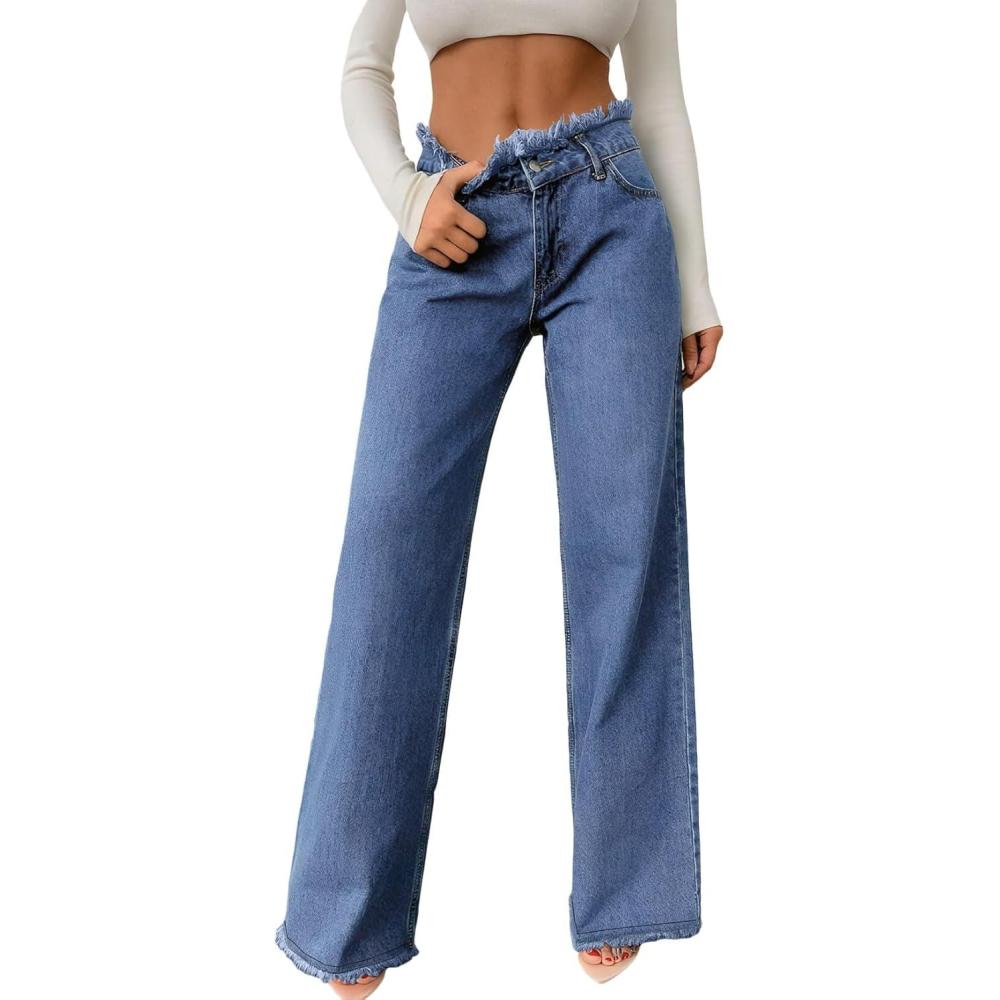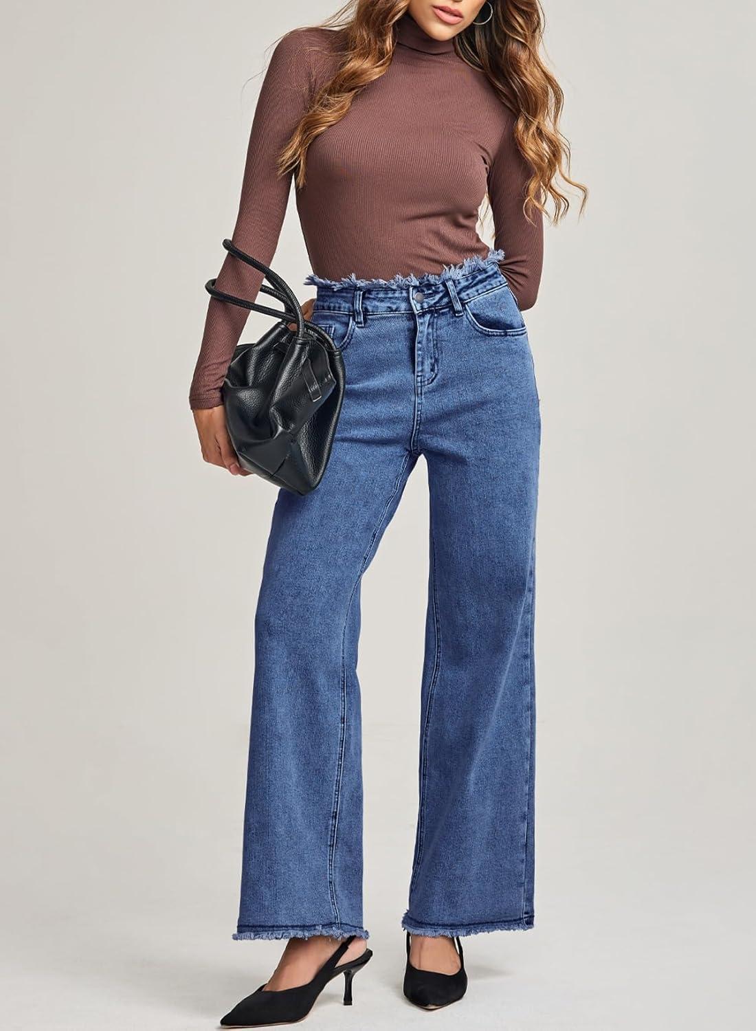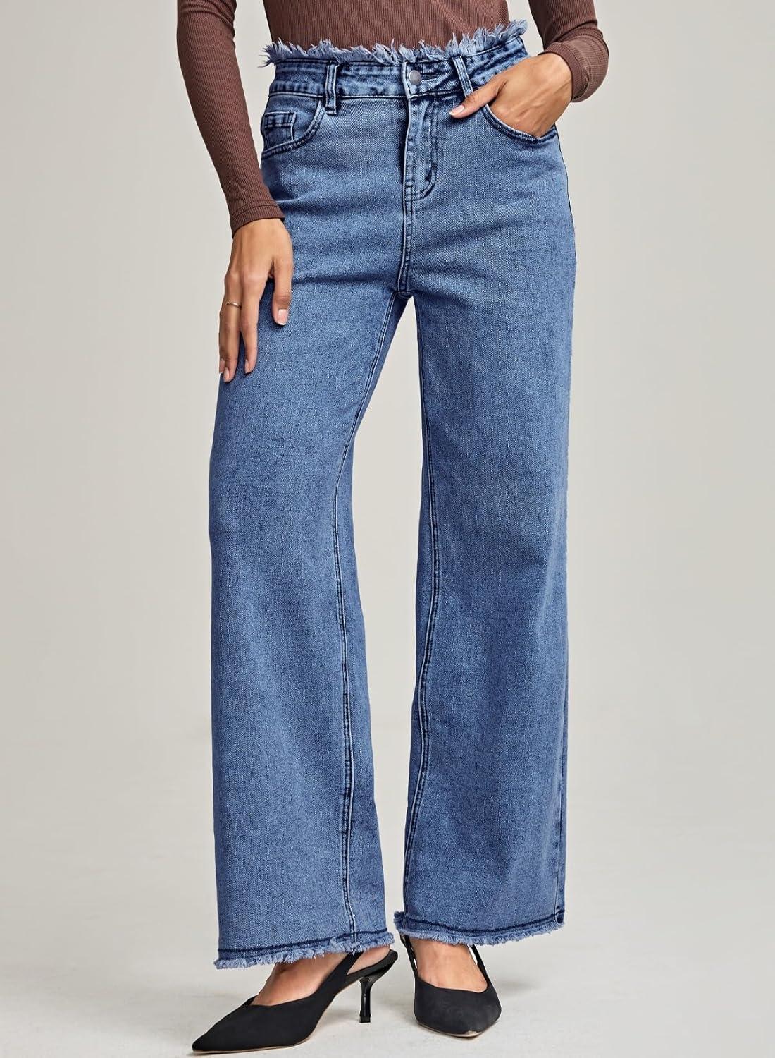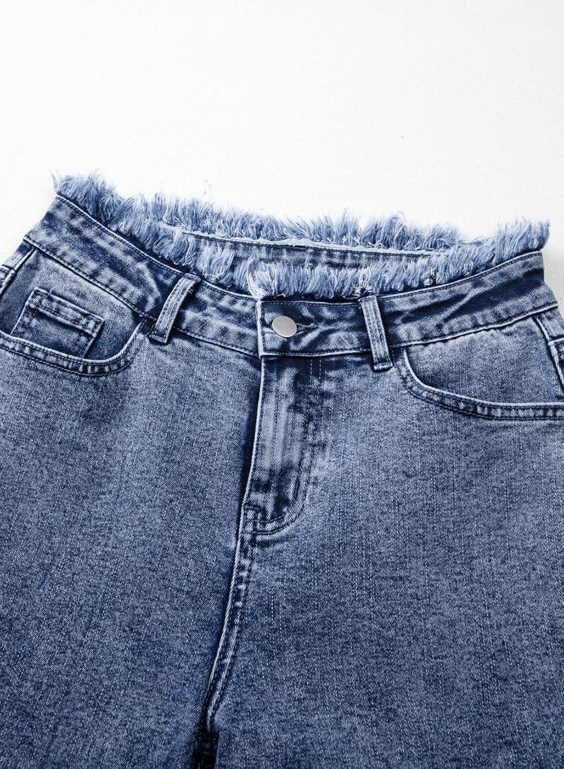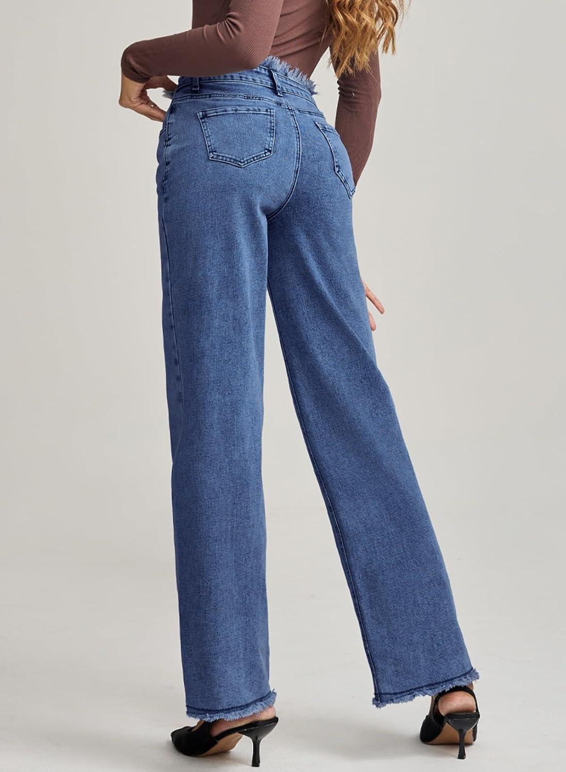 Astylish Womens High Waisted Raw Hem Jeans Stretchy Wide Leg Frayed Straight Denim Pants(Dusk Blue)
