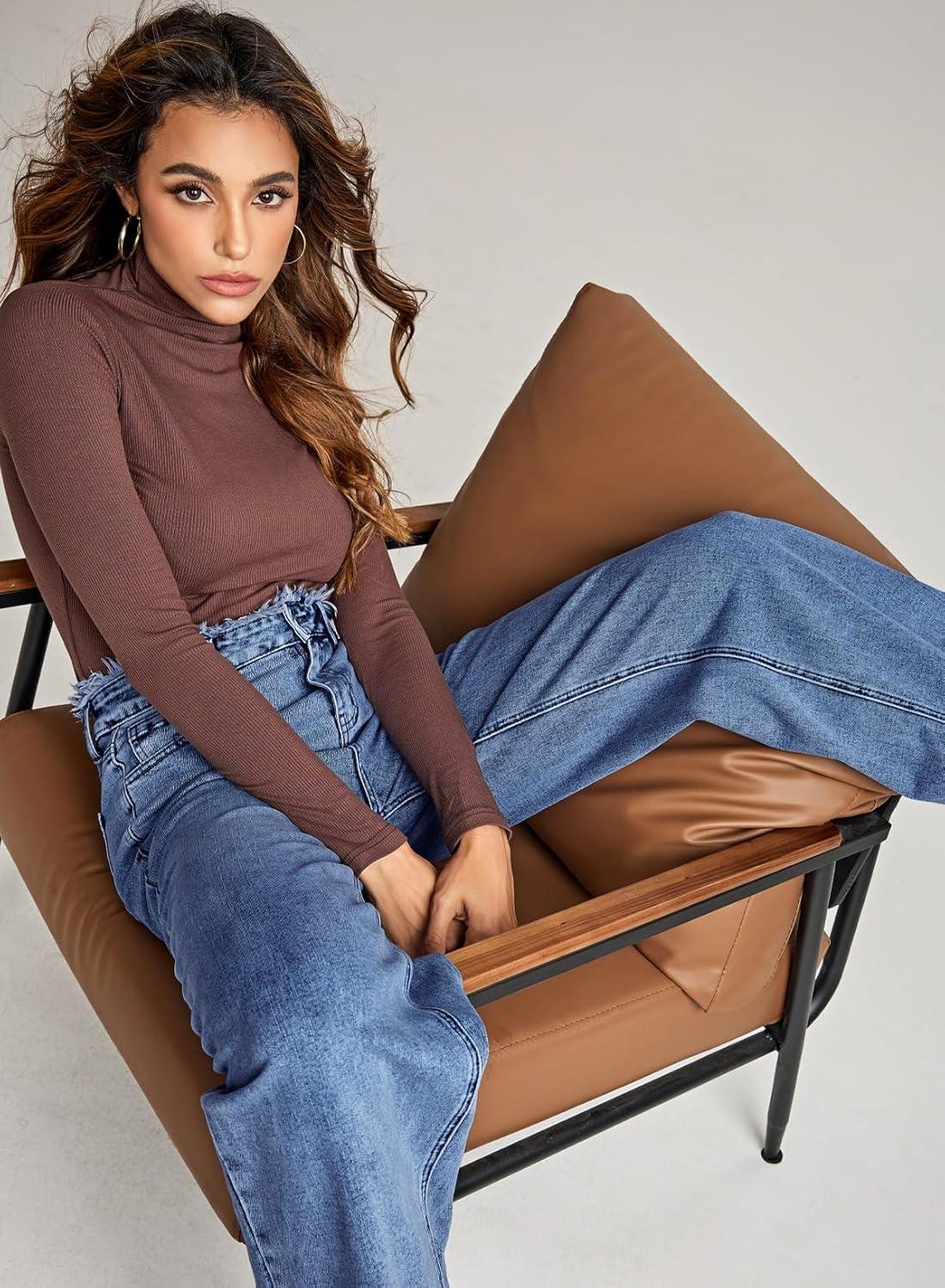 Astylish Womens High Waisted Raw Hem Jeans Stretchy Wide Leg Frayed Straight Denim Pants(Black)