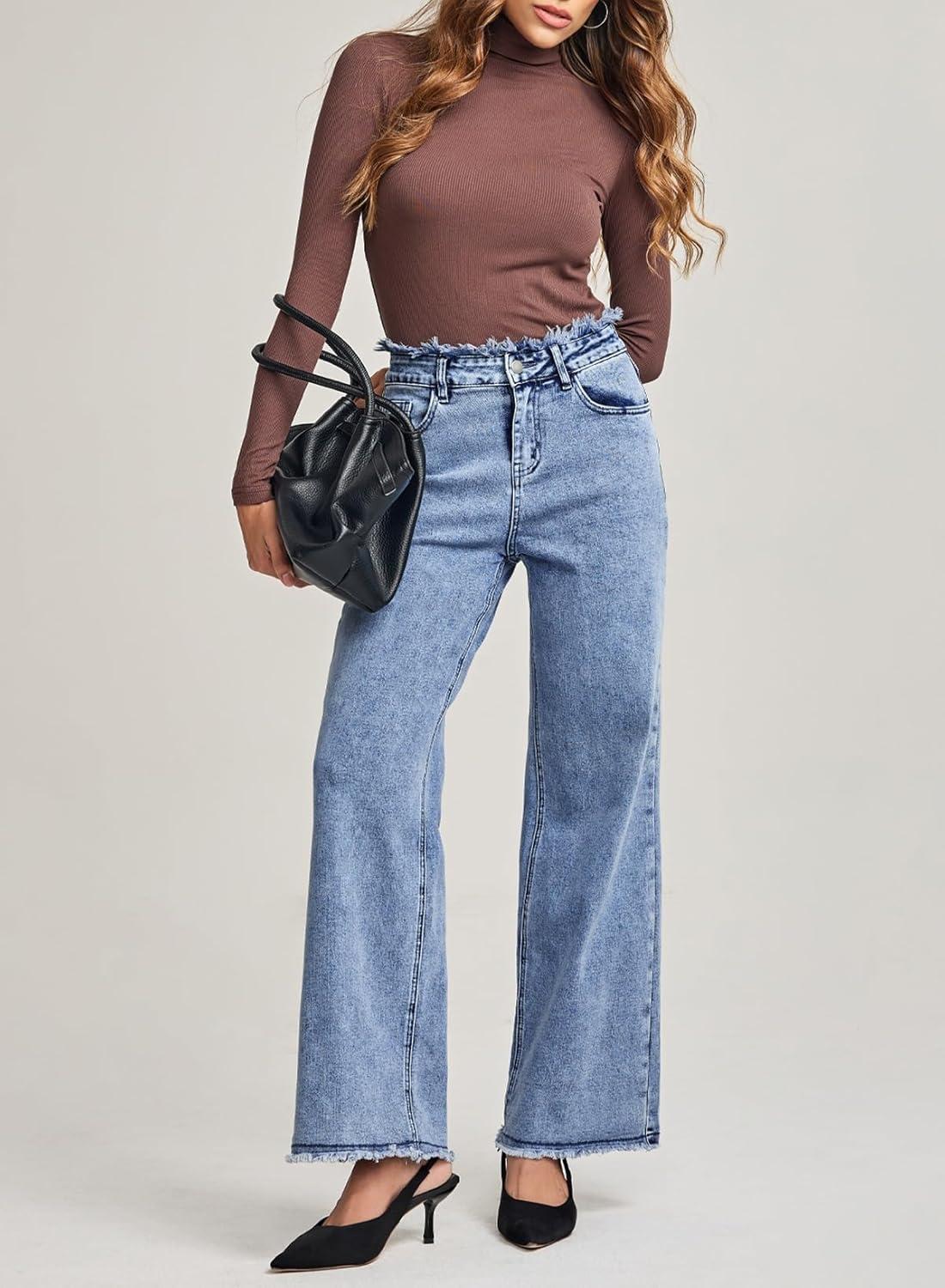 Astylish Womens High Waisted Raw Hem Jeans Stretchy Wide Leg Frayed Straight Denim Pants(Myosotis)