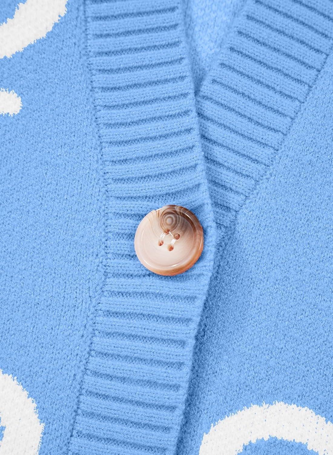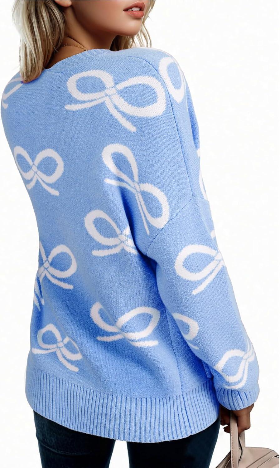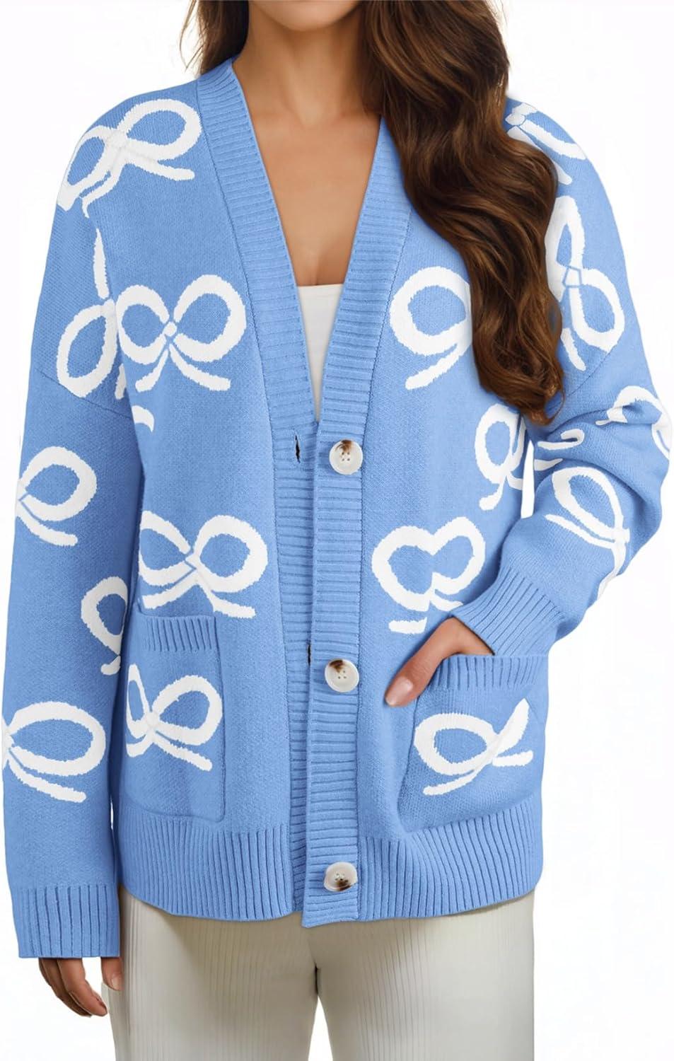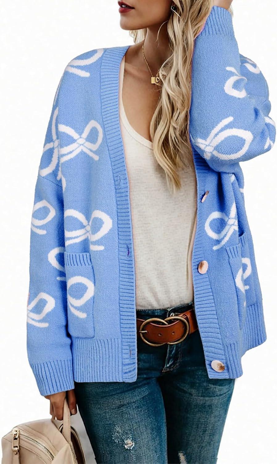 Astylish Womens Open Front Knit Cardigan Sweaters Button Down Bow Printed Outwear Coat with Pockets(Light Blue)