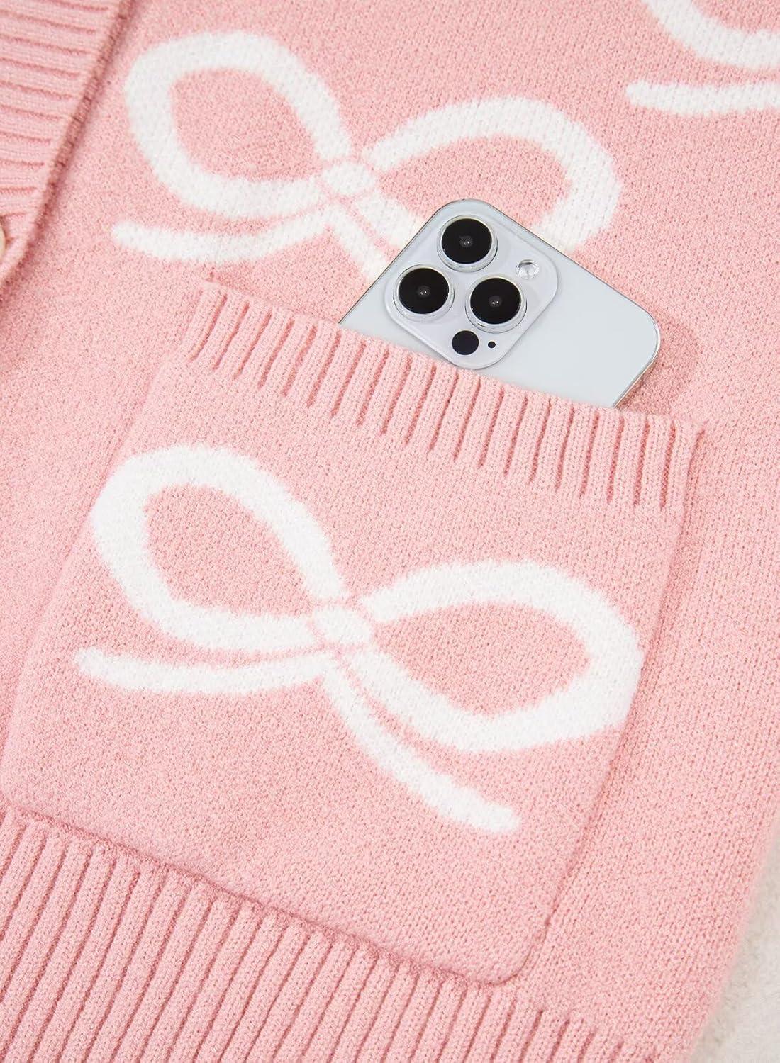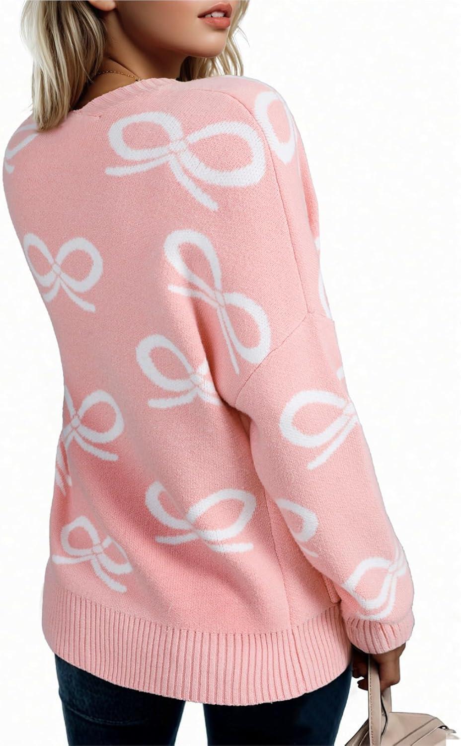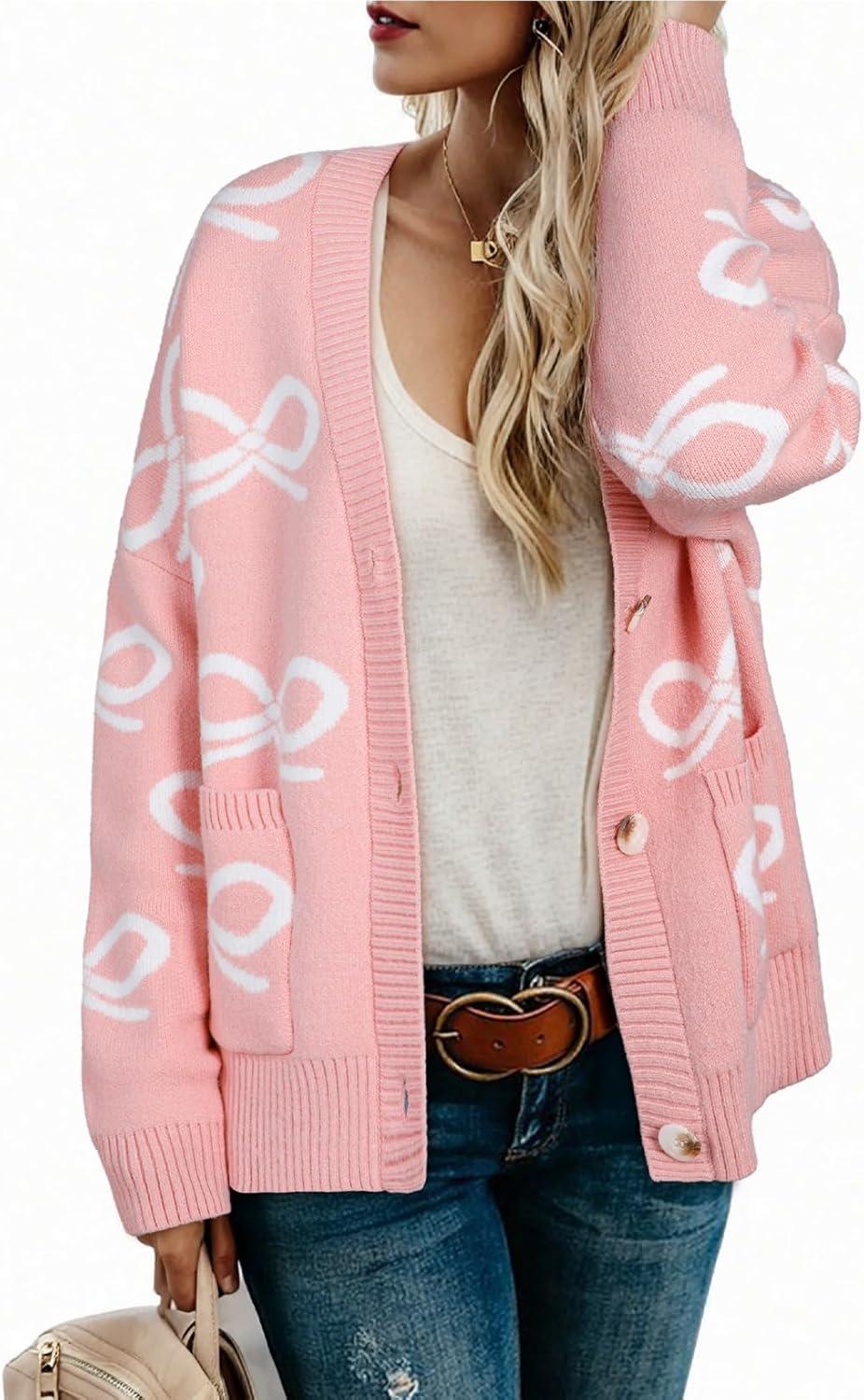 Astylish Womens Open Front Knit Cardigan Sweaters Button Down Bow Printed Outwear Coat with Pockets(Pink)