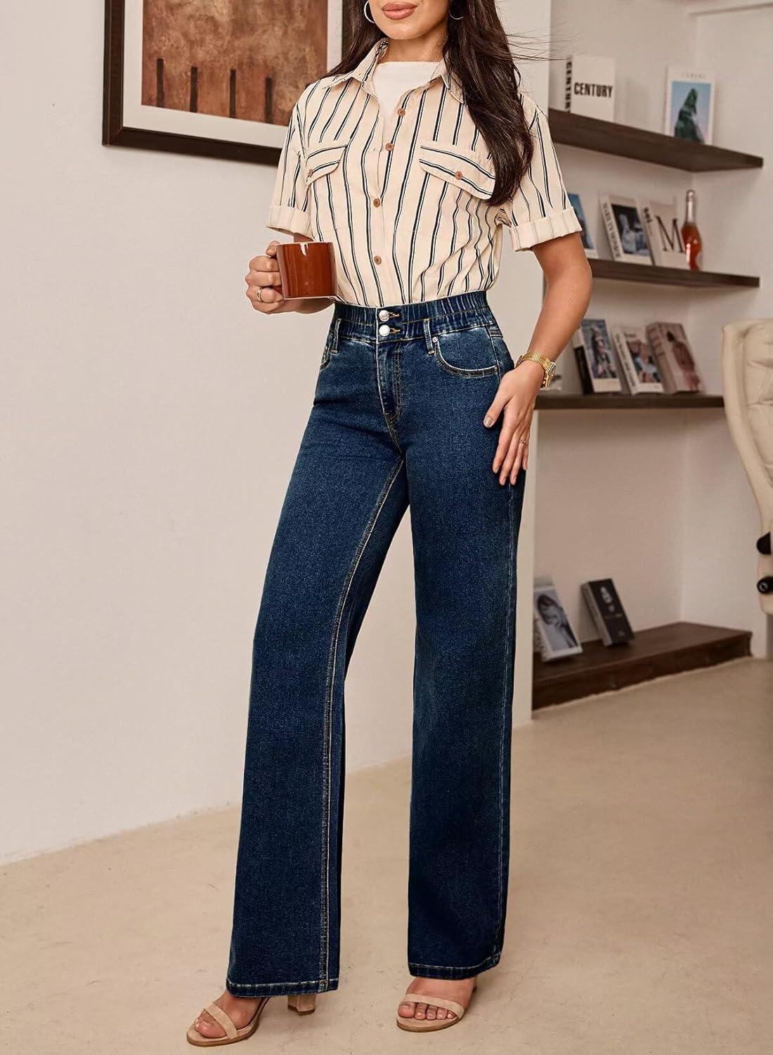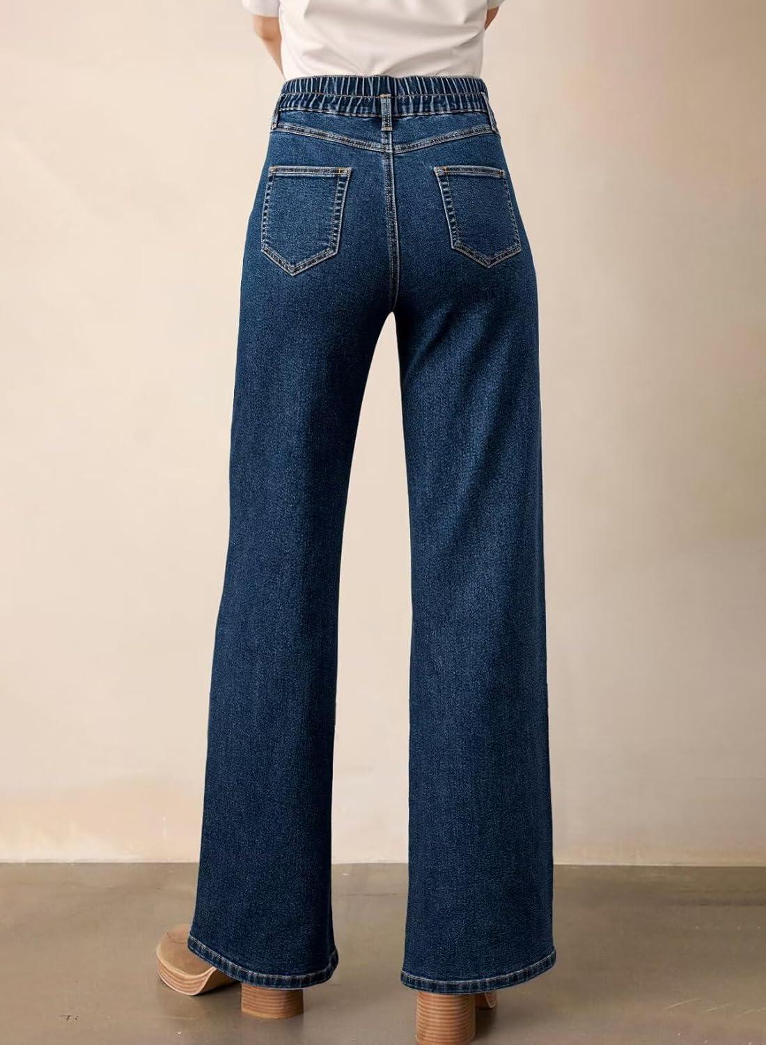 Astylish Women’s Stretch Elastic High Waisted Jeans Trendy Baggy Wide Leg Straight Denim Pants(Navy Blue)