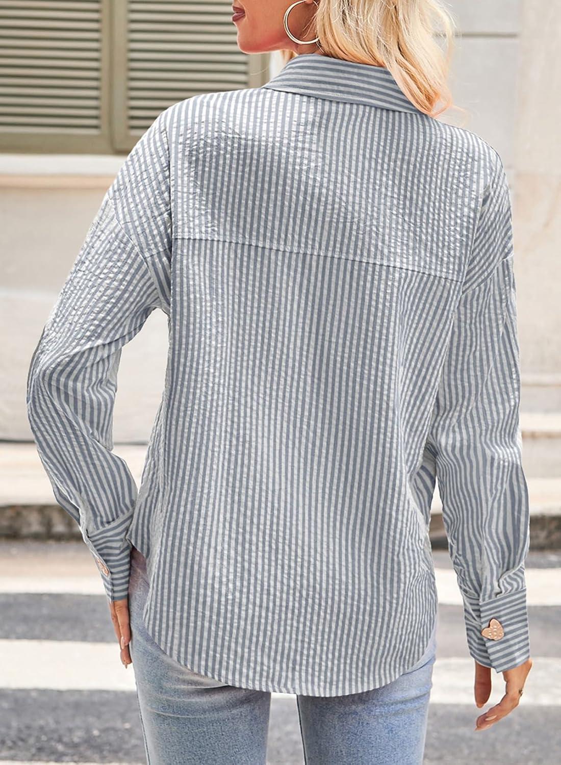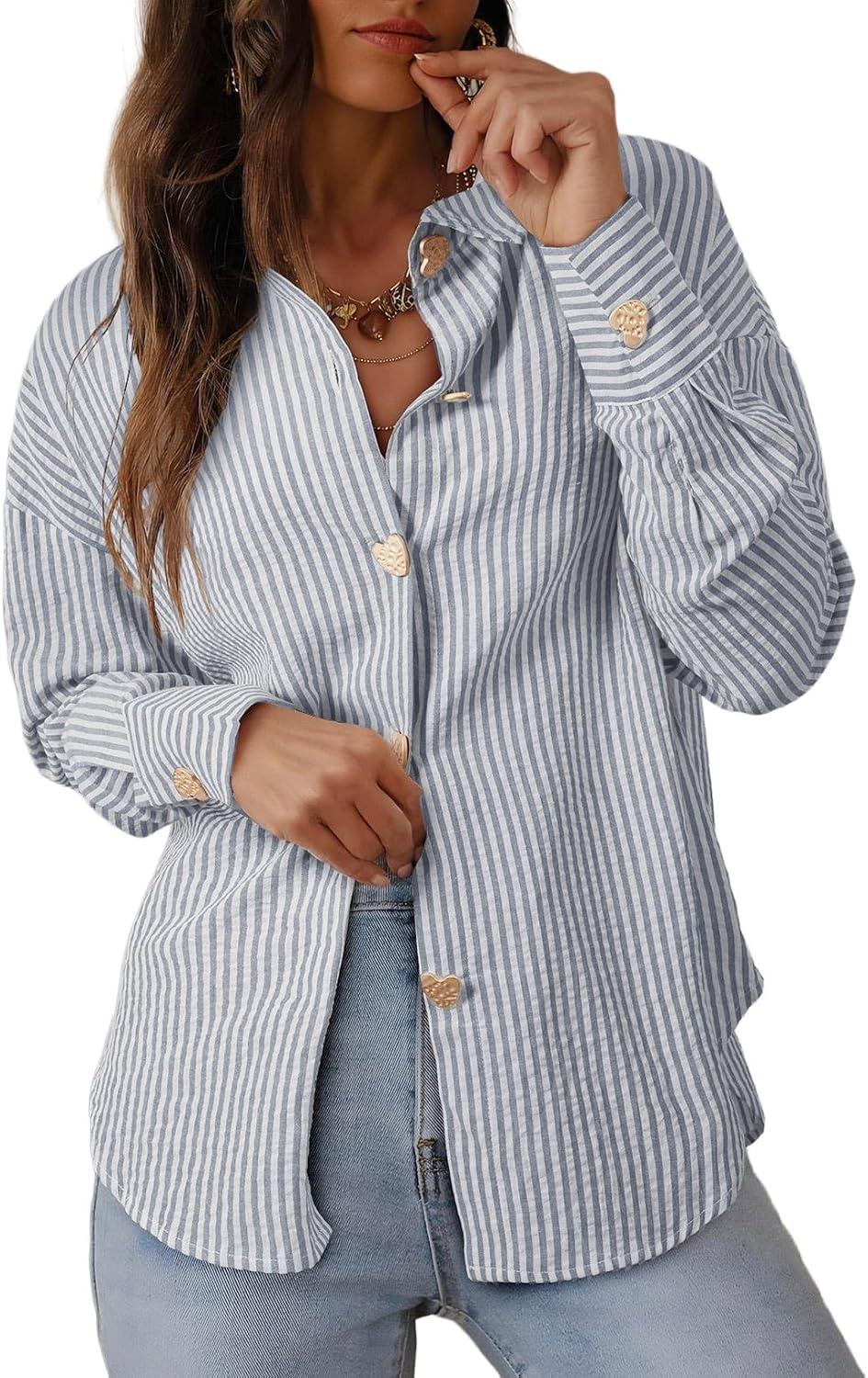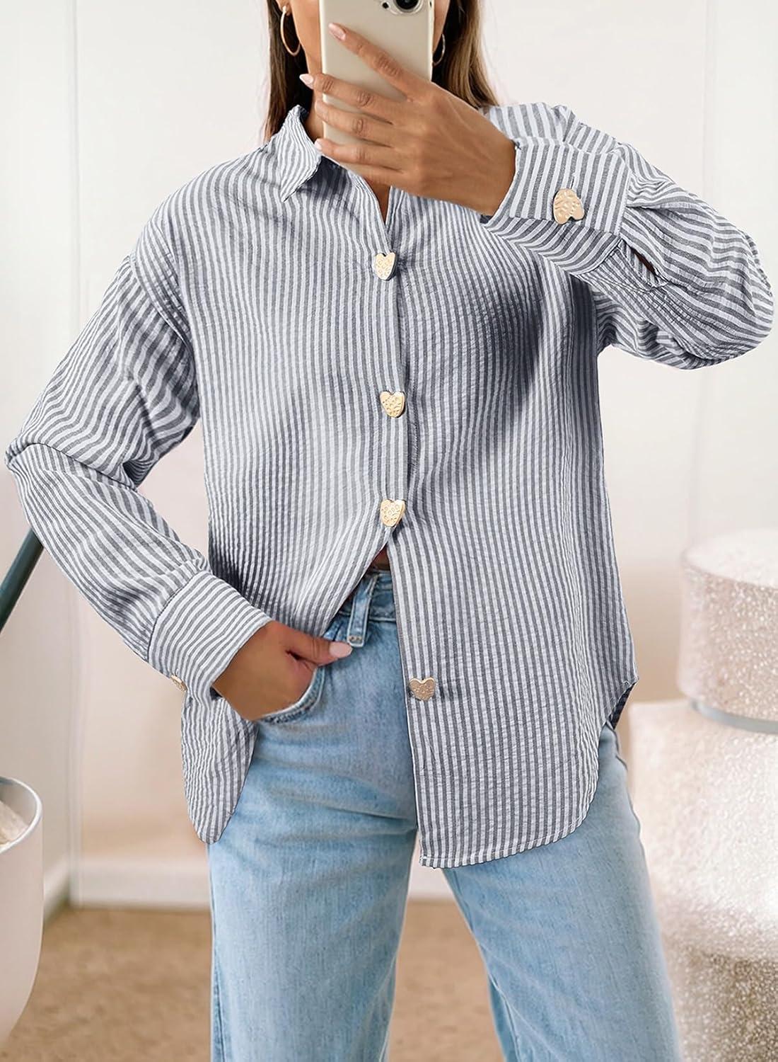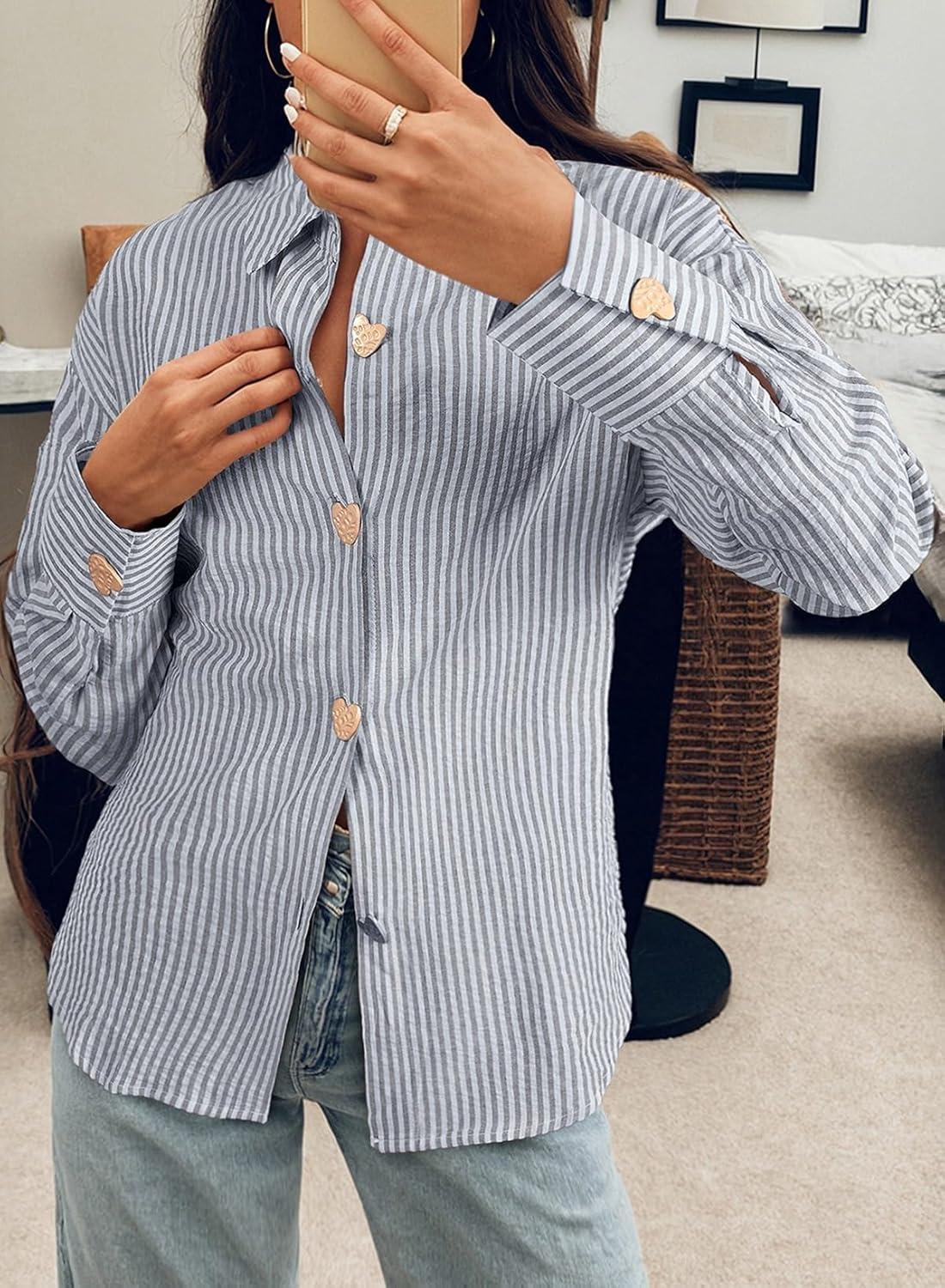 Astylish Women’s Striped Dress Shirt Long Sleeve Collared Metal Heart Shaped Button Down Blouse Tops(Light Grey)