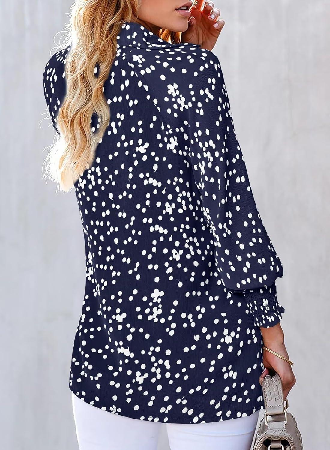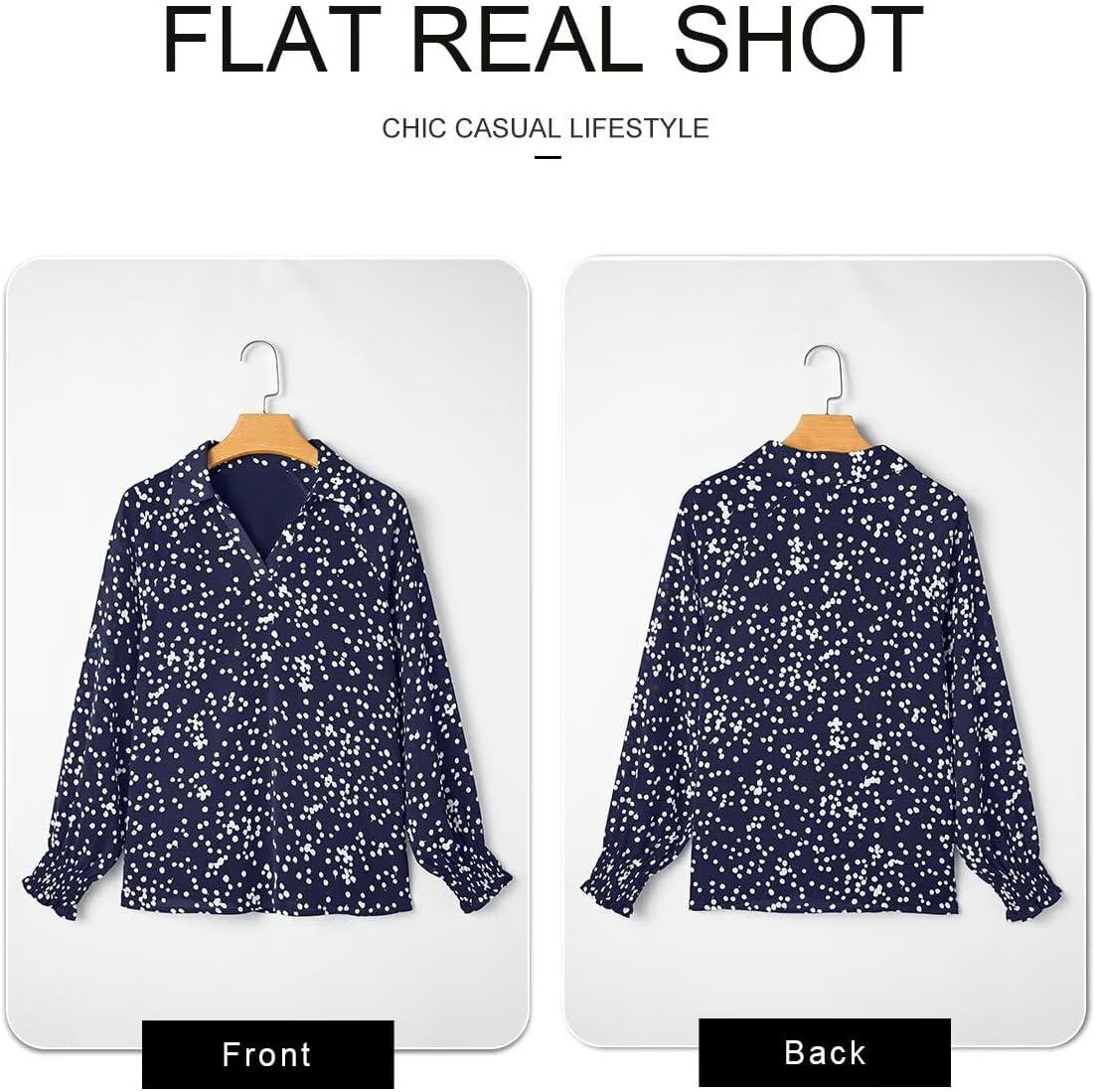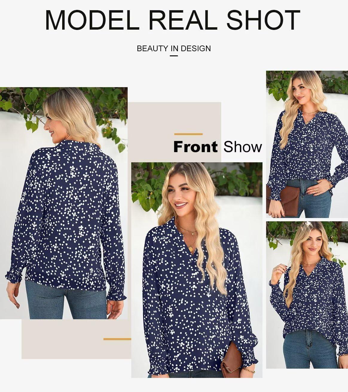 Astylish Women’s Trendy Polka Dot Alicia Floral Blouses Long Sleeve Shirts Chiffon V Neck Bohemian Collared Tops(Dark Blue)