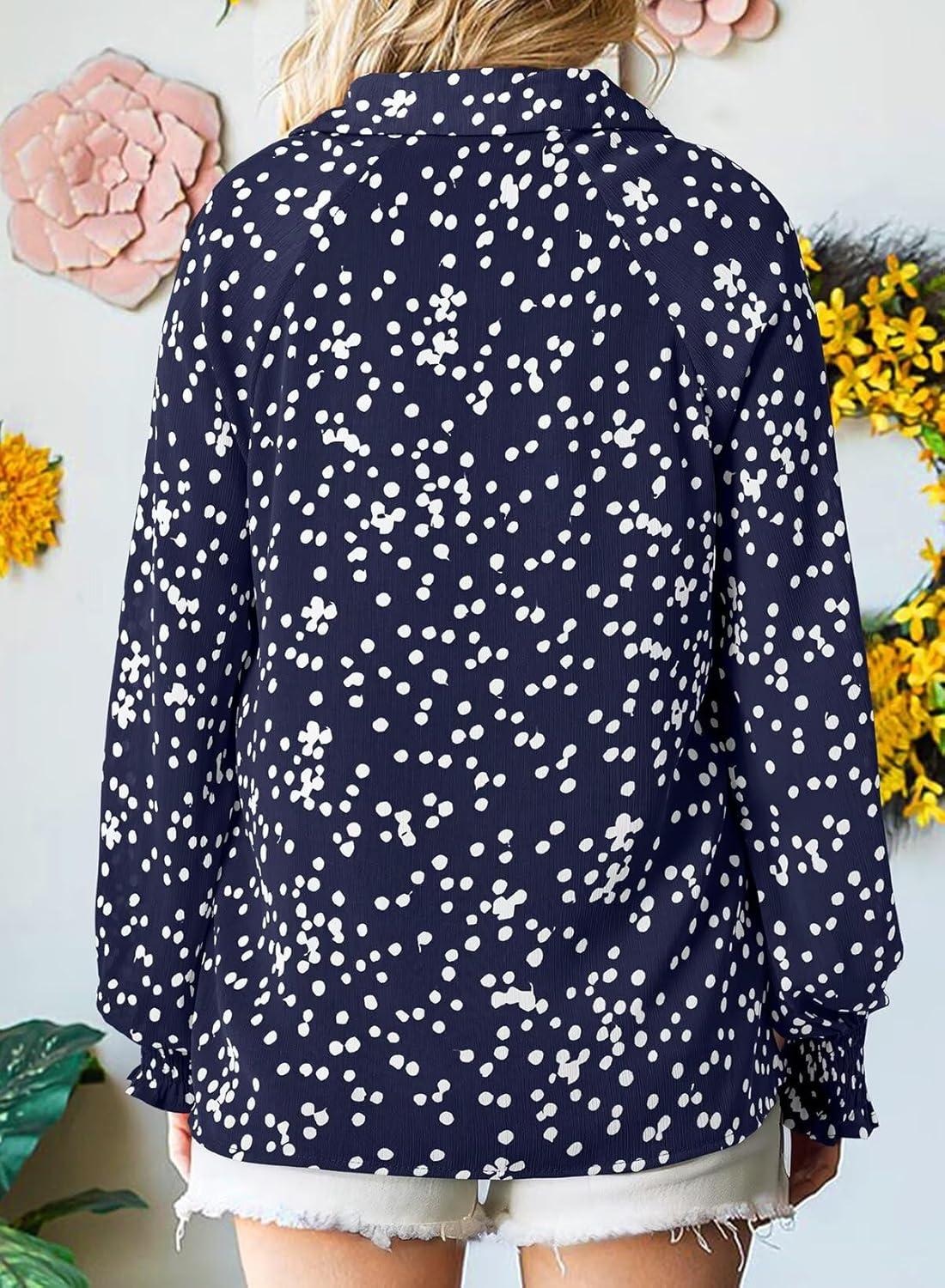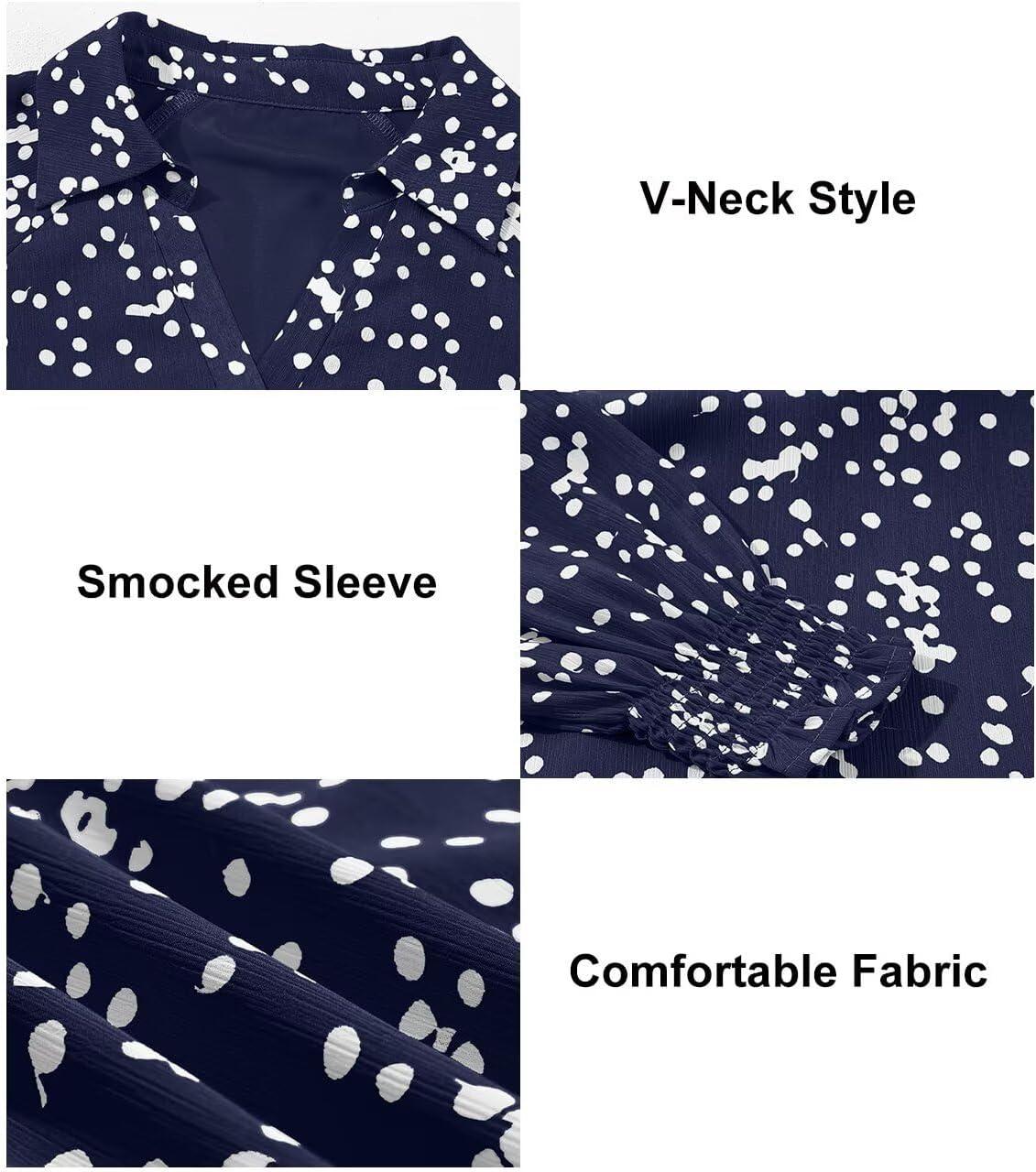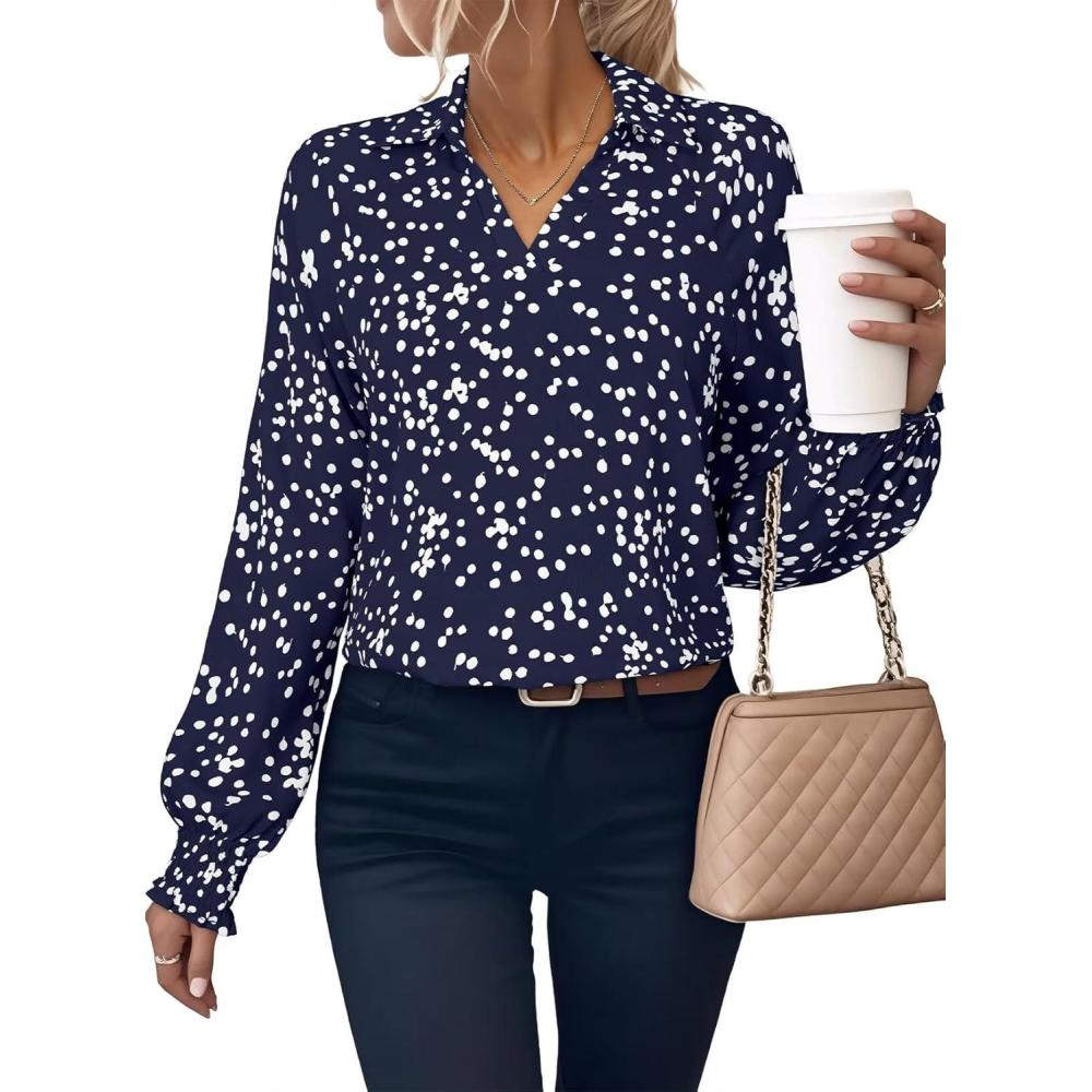 Astylish Women’s Trendy Polka Dot Alicia Floral Blouses Long Sleeve Shirts Chiffon V Neck Bohemian Collared Tops(Dark Blue)