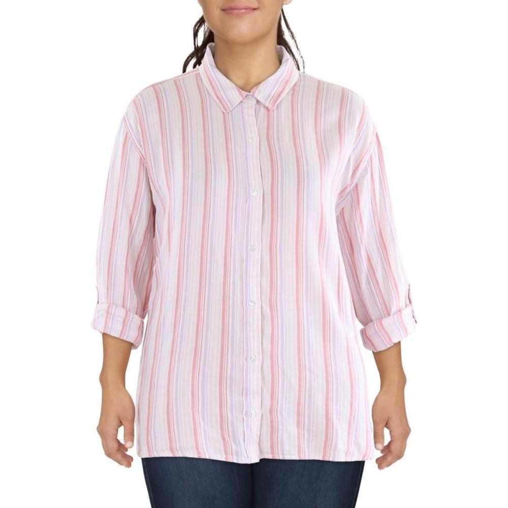Gloria Vanderbilt Women's Apparel; Amanda classy feminine cut button up shirt with the brand logo monogram signature swan located at hip. This versatile ladies oversized top with rolled up tab long sleeves with high low hem hanging over a pair of shorts and cute wedges to attend a family BBQ or get tucked in a sleek pair of slacks with killer heels for the corporate office. It's light weight fabric in pretty assorted colors / prints / plaids / stripes are perfect to wear to work, attending classes or happy hour with friends and ideal travel attire whether for business or pleasure. It's the female shirt game changer we have been waiting for so get yours today! – Gloria Vanderbilt Brand; a versatile yet classic look that attracts and connects with the modern sensibility of consumers of all ages.